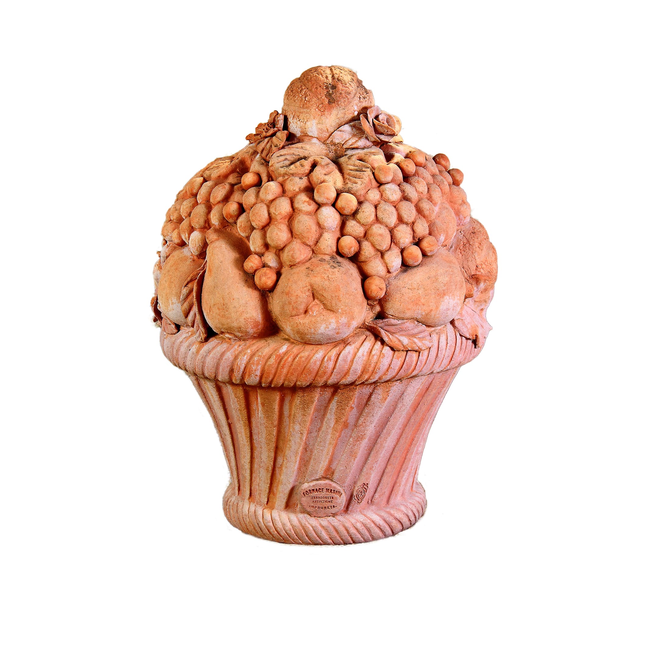 Ein großer, stilisierter Obstkorb aus Impruneta Terracotta, handgefertigt und mit edlen Details wie Trauben, Birnen und Granatäpfeln verziert, ist ein beeindruckendes Kunstwerk. Die Terrakotta aus Impruneta ist bekannt für ihre Haltbarkeit und Frostsicherheit.
