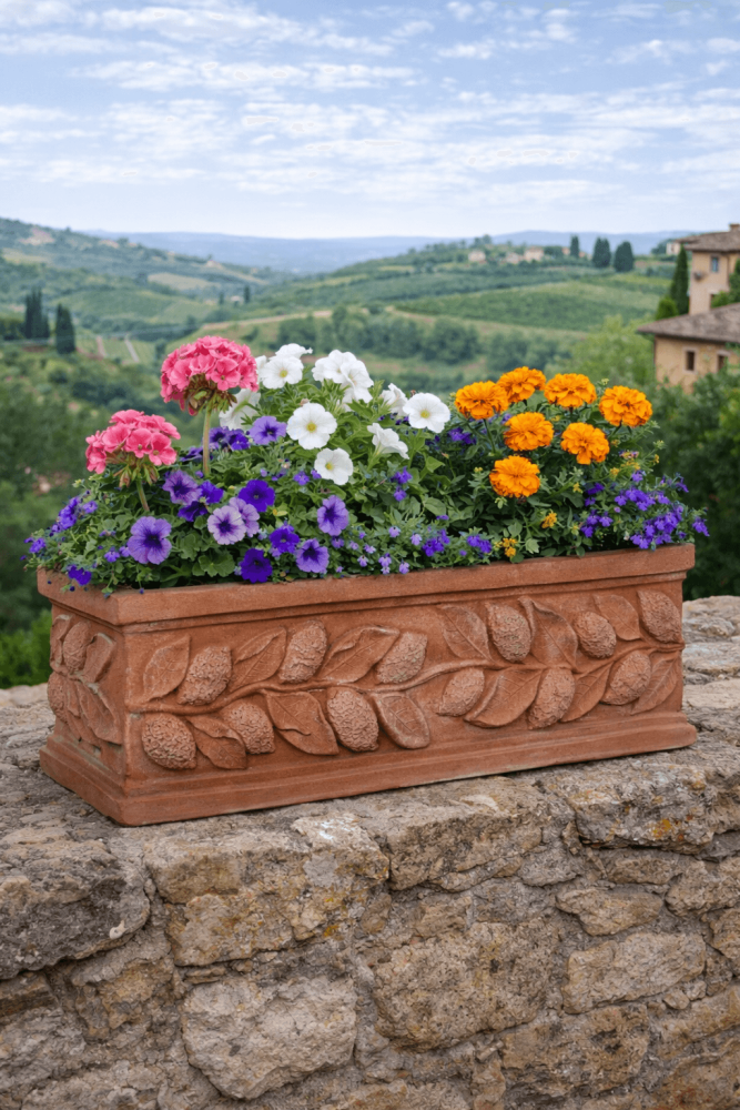 Die hochwertige, handgefertigte Oberfläche verleiht dem Gefäß eine zeitlose Ausstrahlung, während seine stabile Bauweise für Langlebigkeit und Beständigkeit sorgt. Ob als dekoratives Einzelstück oder als Teil einer stilvollen Gartengestaltung – dieser Impruneta-Pflanzkasten bringt südliches Flair und natürliche Eleganz in jeden Außenbereich.