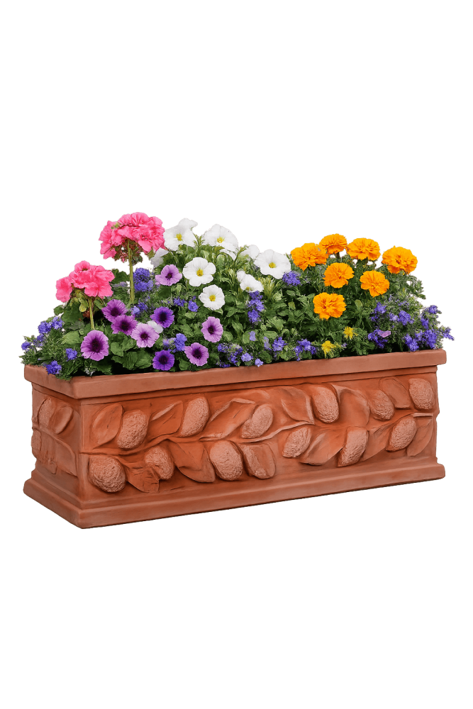 Mit seinen großzügigen Maßen bietet der Pflanzkasten ausreichend Platz für vielfältige Bepflanzungen – von mediterranen Kräutern bis hin zu einer prachtvollen Zitronenranke, die sich elegant um das Gefäß windet. Das Zusammenspiel der warmen, erdigen Töne der Terracotta mit dem frischen Grün der Pflanzen schafft eine authentische, mediterrane Atmosphäre und macht den Pflanzkasten zum Blickfang in jedem Garten oder auf jeder Terrasse.