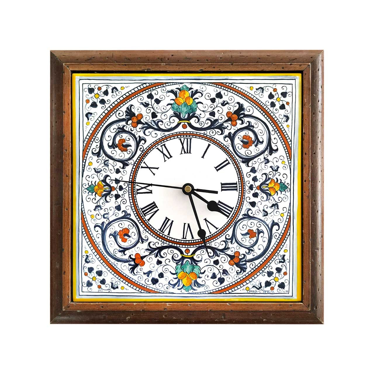 Diese quadratische Wanduhr aus Deruta ist ein wahres Meisterwerk italienischer Majolika-Kunst. Ihr Ziffernblatt ist auf heller Keramik handbemalt und zeigt eine kunstvolle Komposition aus floralen Ornamenten, die in leuchtenden Farben strahlen. Zarte Ranken und geschwungene Blütenmotive in warmen Gelb-, Blau-, Grün- und Rottönen schmücken die Oberfläche und verleihen der Uhr eine lebendige Eleganz, die typisch für den klassischen Deruta-Stil ist.