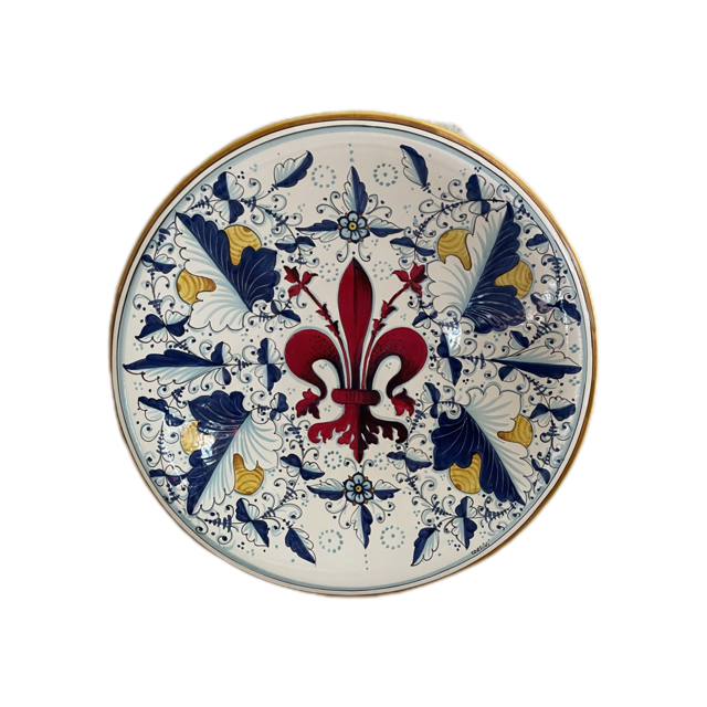 Ein handbemalter Dekoteller aus der Toskana ist ein kunstvolles Stück, das die Eleganz und Tradition der Region einfängt. Dieser spezielle Teller ist aus hochwertiger Keramik gefertigt, und sein weißer Hintergrund bildet eine klassische und dennoch zeitlose Basis für das kunstvolle Design. Im Zentrum des Tellers prangt eine dunkelrote florentinische Lilie, ein ikonisches Symbol der toskanischen Kultur und Geschichte. Die Lilie ist kunstvoll und präzise von Hand bemalt, mit lebendigen Rottönen, die vor dem weißen Hintergrund strahlen. Die Details der Blume sind fein ausgearbeitet, und ihre eleganten Blütenblätter verleihen dem Teller eine königliche und raffinierte Note. Um die Lilie herum sind elegante blau-weiße Blattmotive kunstvoll angeordnet. Diese Muster sind charakteristisch für die handbemalte Keramik aus der Toskana und verleihen dem Teller eine subtile und dennoch auffällige Verzierung. Die Kombination von Blau und Weiß erzeugt ein klassisches toskanisches Flair, das die Handwerkskunst und das Erbe dieser Region widerspiegelt. Die feinen Linien und Details auf dem Teller zeigen die Sorgfalt und Präzision der Handwerkskunst. Jeder Pinselstrich ist mit Bedacht gesetzt, um ein harmonisches und ästhetisch ansprechendes Gesamtbild zu schaffen. Ein handbemalter Dekoteller aus der Toskana mit einer florentinischen Lilie und blau-weißen Blattmotiven ist nicht nur ein visuell ansprechendes Kunstwerk, sondern auch ein Symbol für Eleganz, Geschichte und kulturelle Tiefe. Er eignet sich als dekoratives Element, das Räume aufwertet und einen Hauch von toskanischem Flair und Raffinesse verleiht.