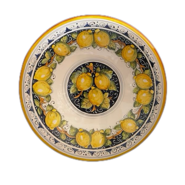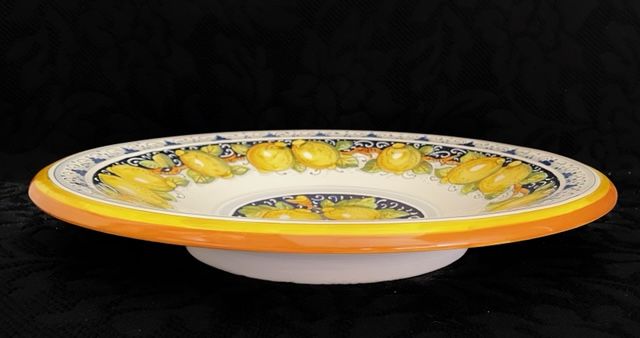 Der handbemalte Keramik-Teller aus der Toskana zeigt eine bezaubernde Darstellung von prächtigen Zitronen, die vor einem strahlend weißen Hintergrund mit sanften blauen Akzenten arrangiert sind. Die Pinselführung ist lebhaft und präzise, wodurch die Textur und Glätte der Zitronenschale mit bemerkenswerter Detailgenauigkeit wiedergegeben wird. Jede Zitrone trägt Nuancen von Schattierungen, die ihre natürliche Vielfalt und Einzigartigkeit hervorheben. Der Hintergrund des Tellers ist von einem traditionellen toskanischen Stil geprägt, verziert mit eleganten blauen Mustern. Diese Muster verleihen dem Teller eine rustikale Eleganz und bilden einen charmanten Kontrast zum lebendigen Gelb der Zitronen. Die Gesamtkomposition strahlt eine Atmosphäre mediterraner Frische aus und vermittelt die Schönheit der toskanischen Landschaft. Jeder feine Pinselstrich zeigt die handwerkliche Meisterschaft und das künstlerische Talent des Keramikmalers, während der Teller eine Geschichte von sonnenverwöhnten Zitronenbäumen und der einfachen, doch eindrucksvollen Schönheit der Natur erzählt.