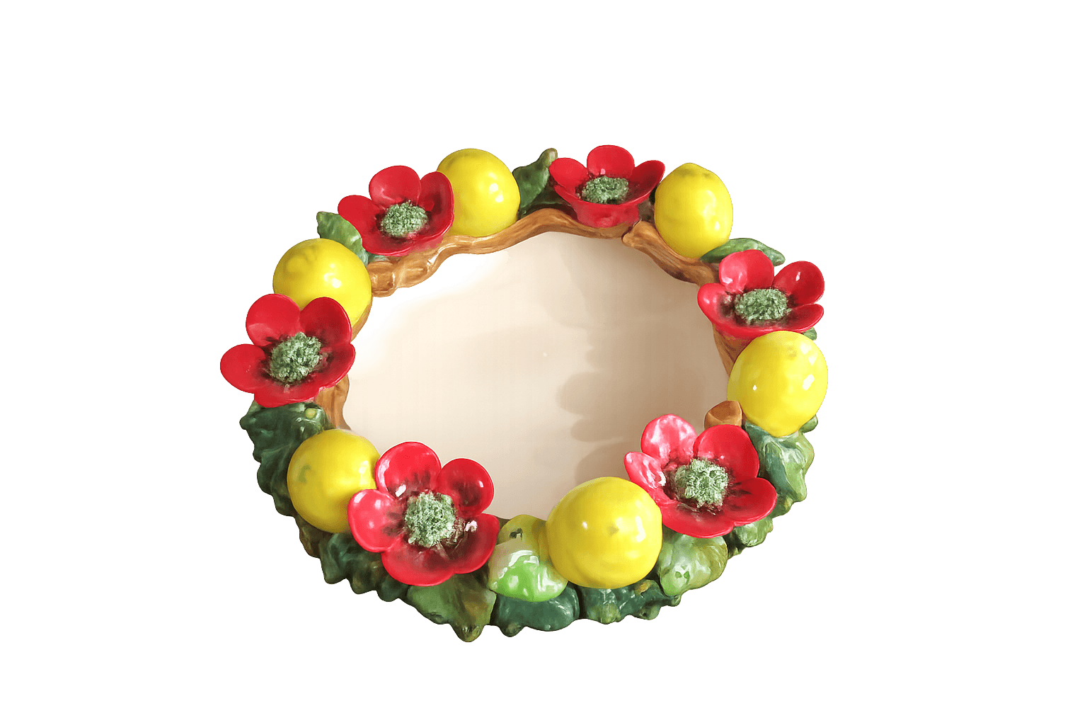 Dieser dekorative Keramikteller aus der Toskana vereint traditionelle italienische Handwerkskunst mit mediterranem Design. Der kunstvoll gestaltete Teller besticht durch einen plastisch geformten Rand mit leuchtend gelben Zitronen, roten Blüten und grünen Blättern. Das harmonische Farbspiel erinnert an die sonnigen Landschaften Italiens und bringt ein Stück mediterranes Lebensgefühl auf den Tisch oder in die Küche.