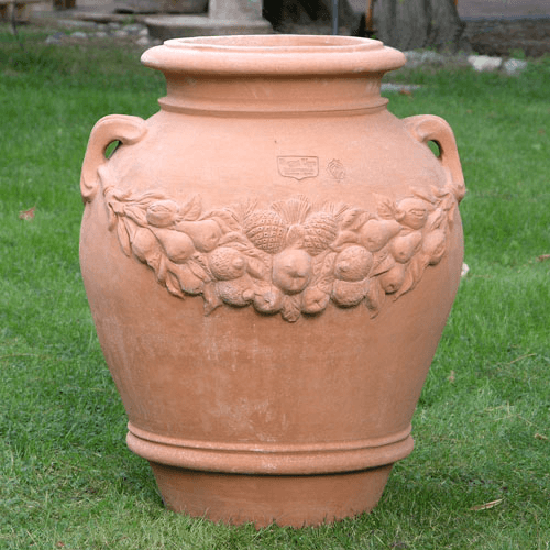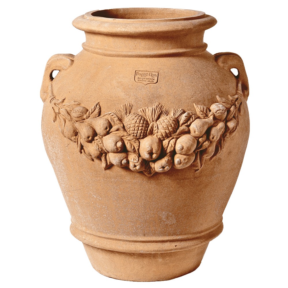 Klassischer, reich verzierter toskanischer Krug von Poggi Ugo mit Henkeln. Er ist verziert mit zwei reichen Girlanden aus mediterranen Früchten im Renaissance-Stil. Frostsicher bis -30°C Höhe 68cm