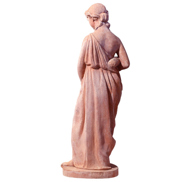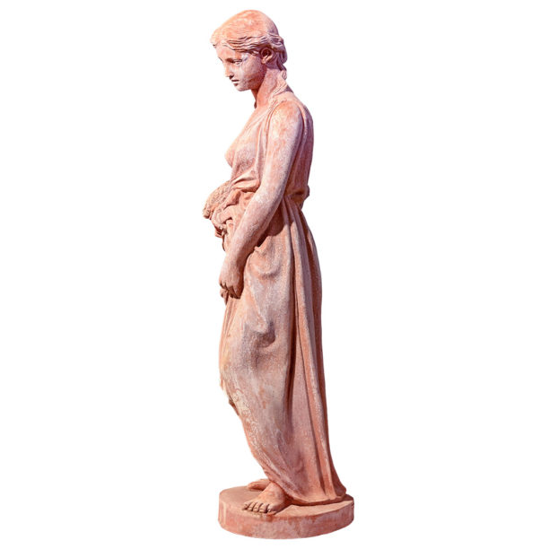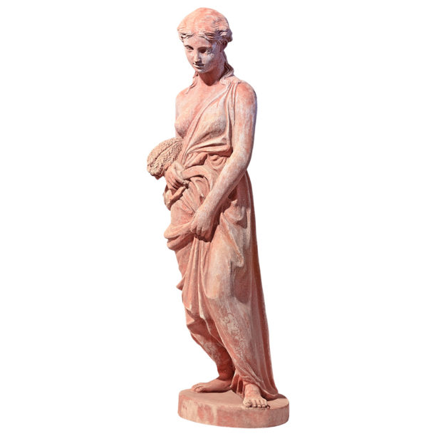 Eine Impruneta Terracotta-Statue, die eine Allegorie auf den Sommer darstellt, ist eine beeindruckende Gartendekoration. Diese Statue zeigt eine elegante Frauenfigur, die in einem fröhlichen und anmutigen Tanzschritt verharrt. Ihr Gesicht strahlt Freude aus, während sie in ihrer Hand eine Handvoll goldener Weizenähren hält. Die Weizenähren sind kunstvoll gestaltet, ihre zarten Formen und Details geben der Statue einen Hauch von Realismus. Die Frauenfigur ist in einem leichten, fließenden Kleid gehüllt, das ihre Bewegungen betont und ihre Anmut unterstreicht. Die Details des Kleides, von den Falten bis zu den Verzierungen, sind meisterhaft gearbeitet und verleihen der Statue eine lebendige Ausstrahlung. Ihre Haare sind in sanften Wellen gestylt und fliegen leicht im Wind, was die Bewegung und Lebendigkeit des Moments einfängt. Die Impruneta Terracotta, aus der diese Statue gefertigt ist, ist bekannt für ihre Haltbarkeit und Frostbeständigkeit. Das bedeutet, dass diese Gartendekoration das ganze Jahr über im Freien stehen kann, ohne Schaden zu nehmen. Die warmen, erdigen Farben der Terracotta verleihen der Statue eine natürliche Ausstrahlung und lassen sie nahtlos in jeden Garten integrieren. Diese Allegorie auf den Sommer mit Weizenähren verkörpert Fülle, Fruchtbarkeit und Überfluss. Sie bringt nicht nur künstlerische Schönheit in den Garten, sondern symbolisiert auch den Reichtum der Natur und den Segen des Sommers.