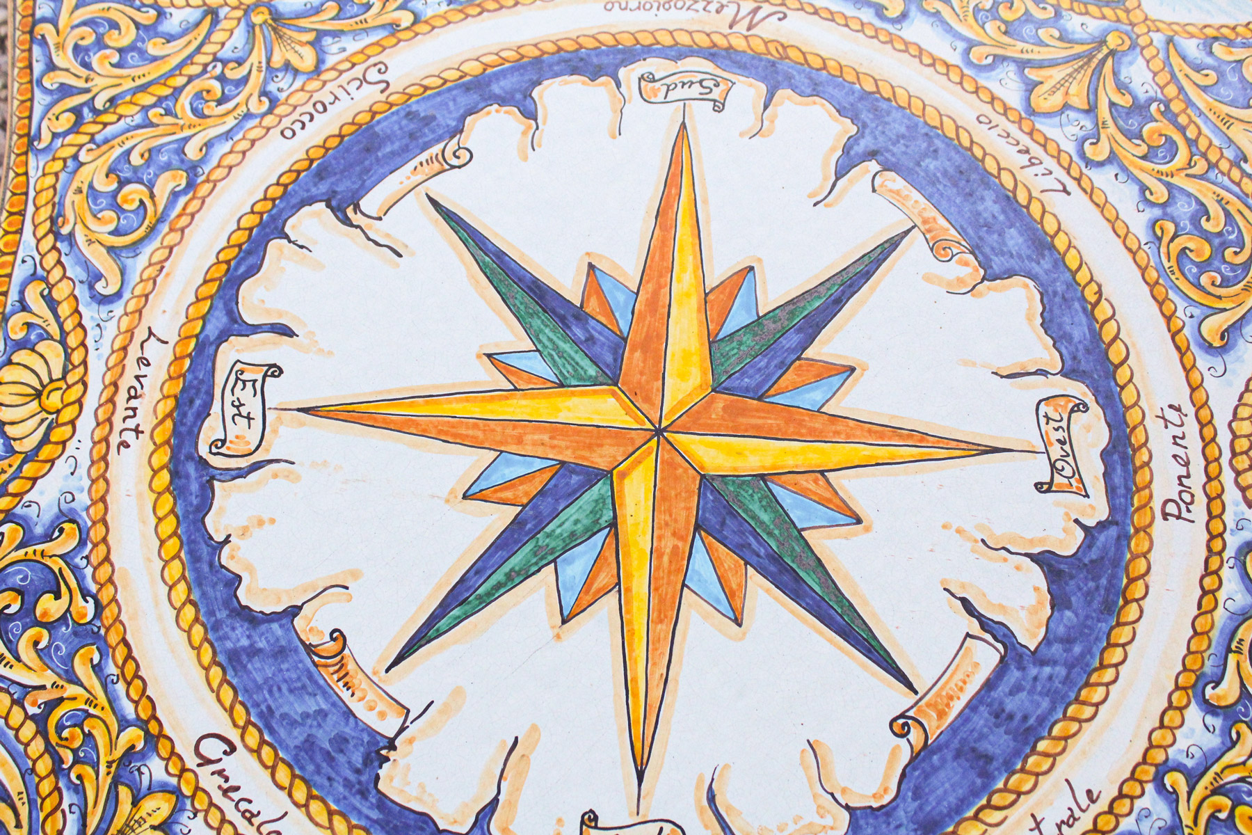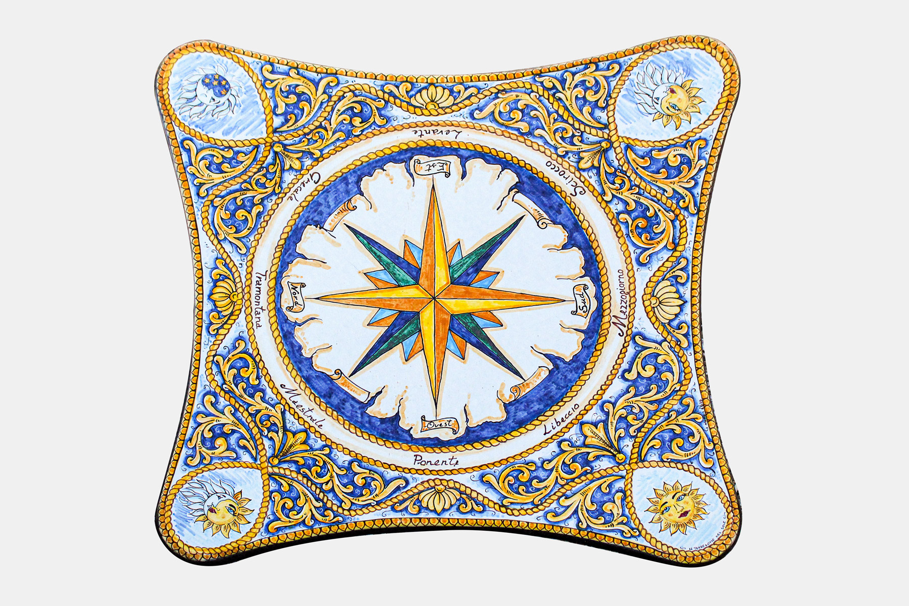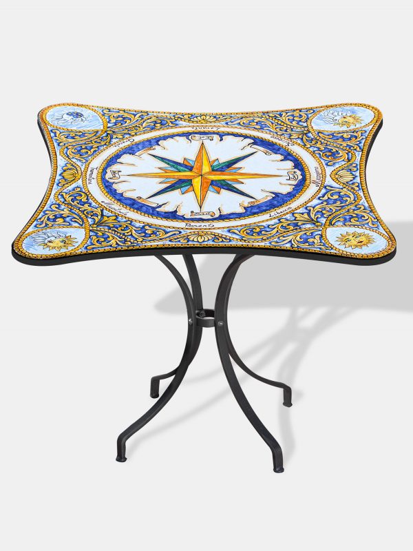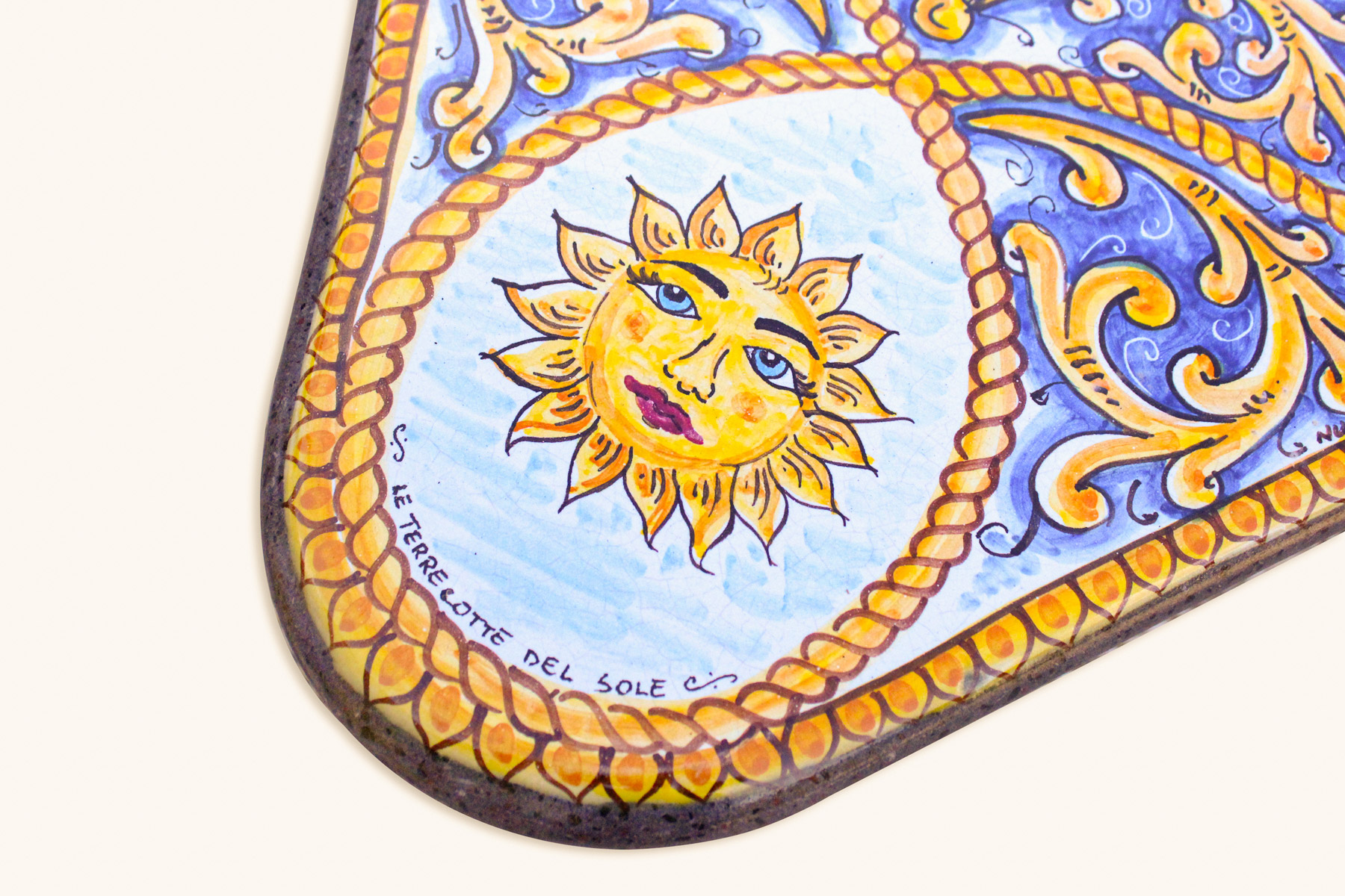 Der quadratische Tisch aus Lavastein aus Sizilien mit abgerundeten Kanten ist ein kunstvoll gestaltetes Möbelstück, das mit einer Vielzahl von verzierten Elementen aufwartet. Die Oberfläche des Tisches ist mit einer Mischung aus floralen Motiven, strahlenden Sonnen in den Ecken und einem markanten Kompasssymbol in der Mitte handbemalt. Die floralen Elemente, die den Rand des Tisches zieren, verleihen ihm eine natürliche Schönheit und Eleganz. Diese werden durch die strahlenden Sonnenmotive in den Ecken ergänzt, die dem Tisch eine lebendige und sonnige Atmosphäre verleihen. Das zentrale Kompasssymbol fügt dem Tisch eine faszinierende Dynamik hinzu. Es kann als Symbol für Orientierung, Reisen oder Abenteuer interpretiert werden und verleiht dem Tisch eine gewisse Raffinesse und Tiefe. Die abgerundeten Kanten des Tisches verleihen ihm ein sanftes und zugleich modernes Erscheinungsbild, das sowohl ansprechend als auch sicher in der Handhabung ist. Das Eisengestell als Fuß sorgt nicht nur für Stabilität, sondern ergänzt auch das kunstvolle Design des Tisches. Die Verfügbarkeit in verschiedenen Größen ermöglicht es, diesen Tisch in verschiedenen Räumen und für unterschiedliche Zwecke einzusetzen, sei es als Ess- oder Beistelltisch. Er fügt sich harmonisch in verschiedene Einrichtungsstile ein und zieht mit seiner kreativen Handbemalung alle Blicke auf sich.