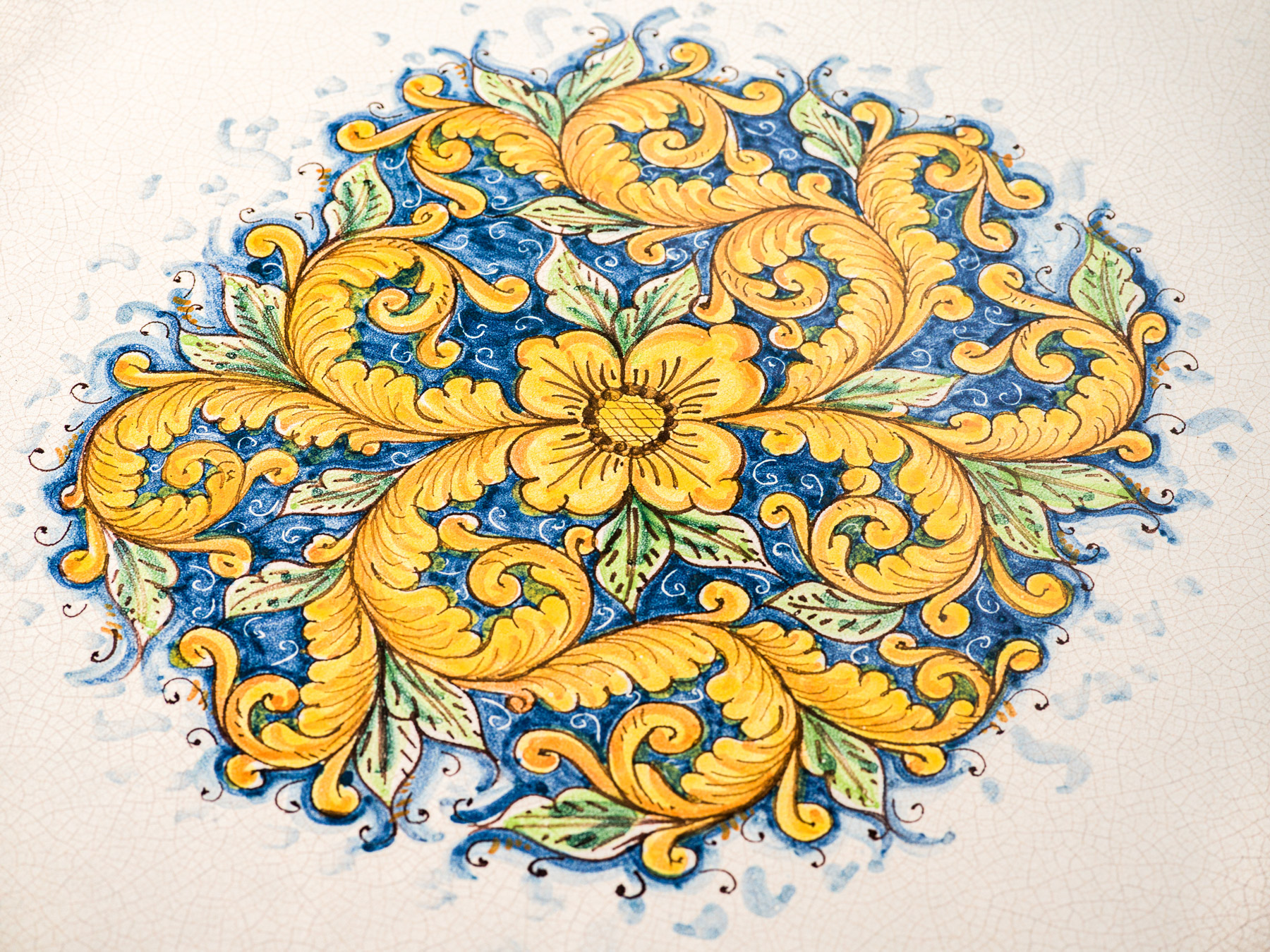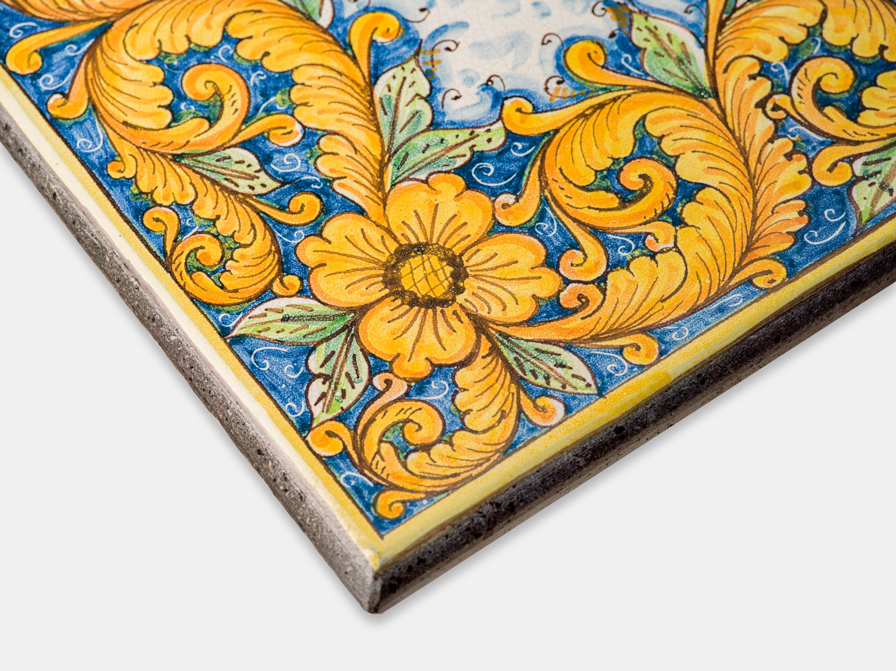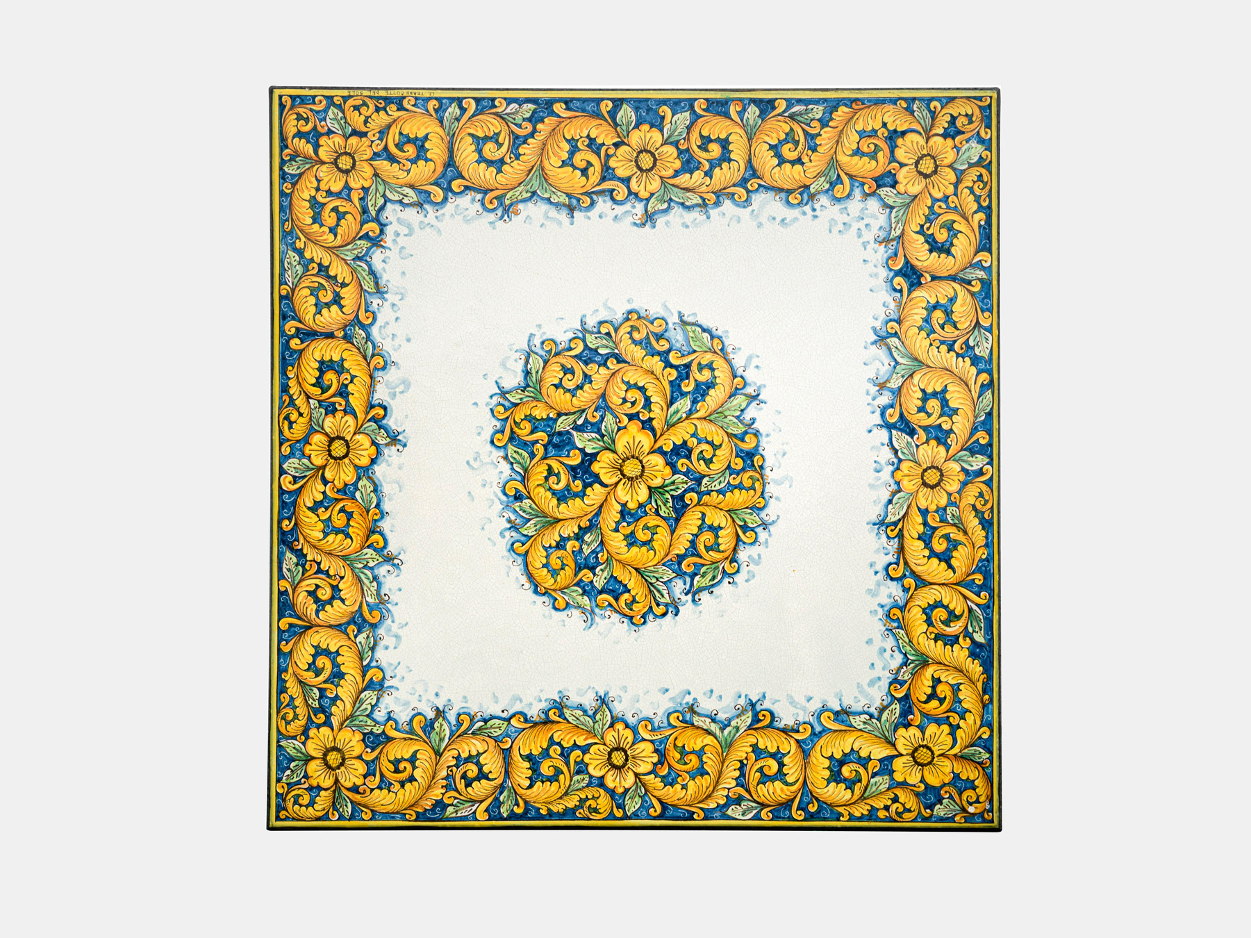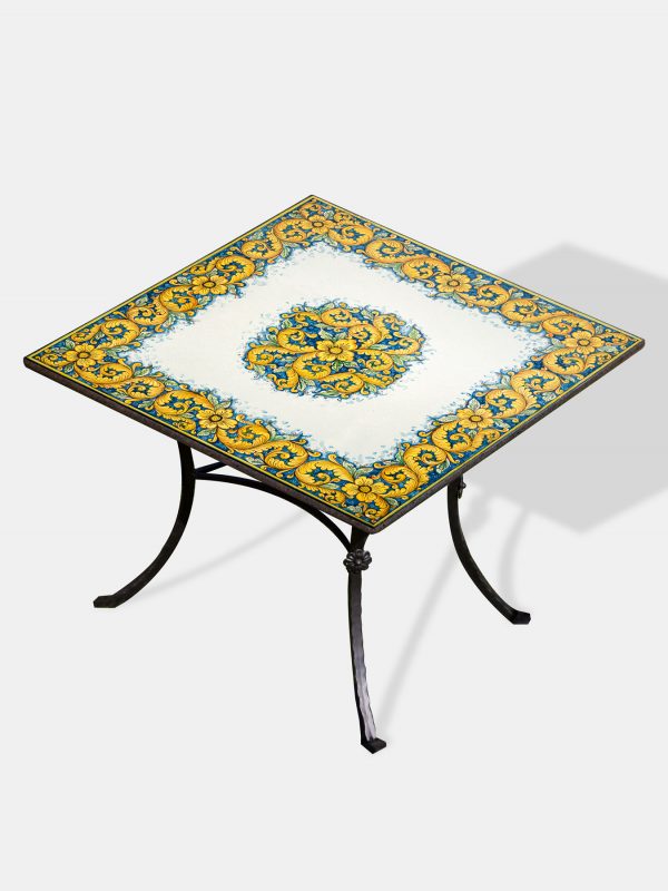 Der quadratische Tisch aus Lavastein aus Sizilien ist ein faszinierendes Kunstwerk, das Funktionalität mit ästhetischer Schönheit vereint. Hergestellt aus Lavastein, der für seine Robustheit und Langlebigkeit bekannt ist, bietet dieser Tisch eine solide Oberfläche für den täglichen Gebrauch. Sein einzigartiges Merkmal liegt in der kunstvollen Handbemalung: Gelbe Blattverzierungen, die auf einem strahlend blauen Hintergrund lebendig wirken.
