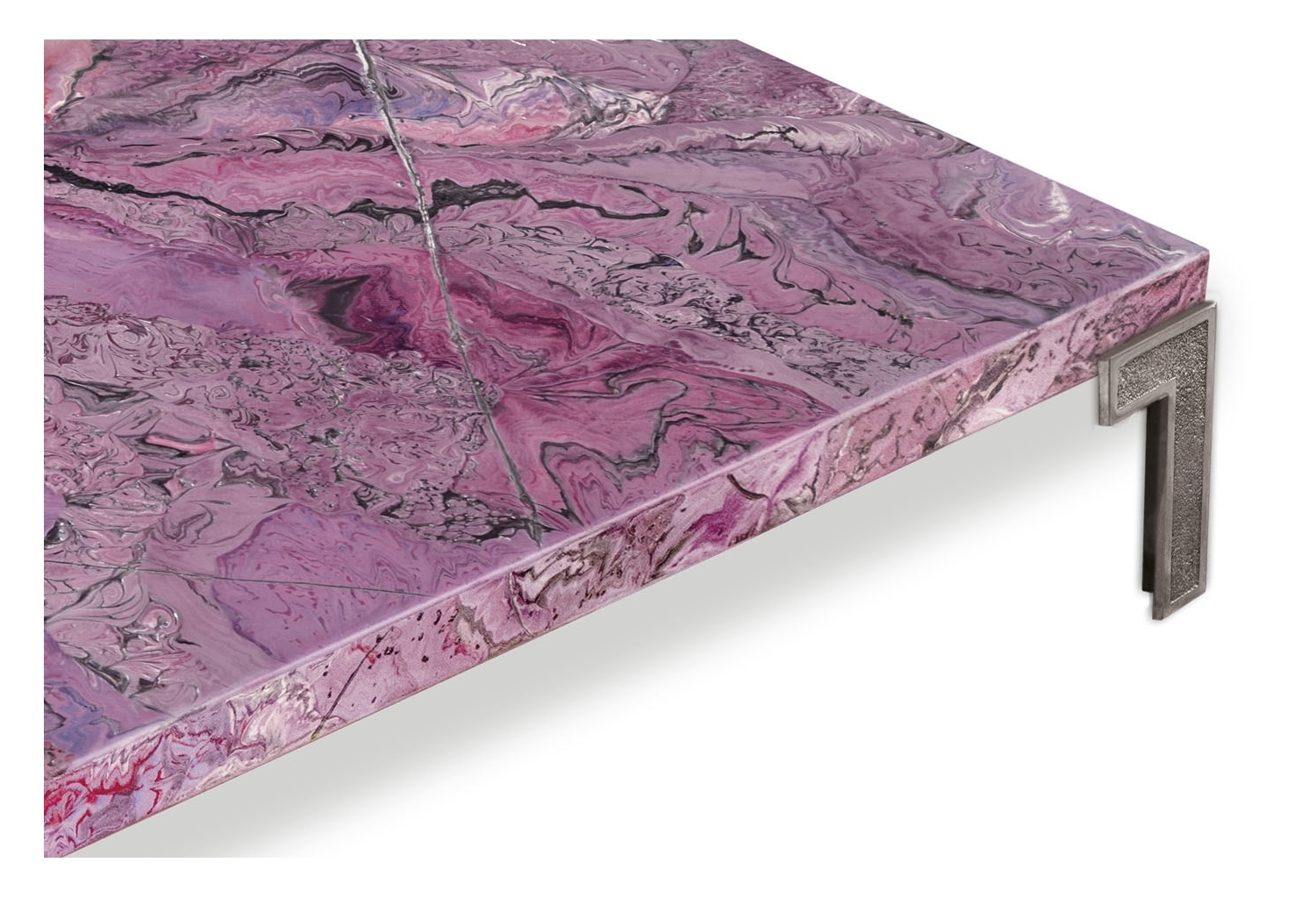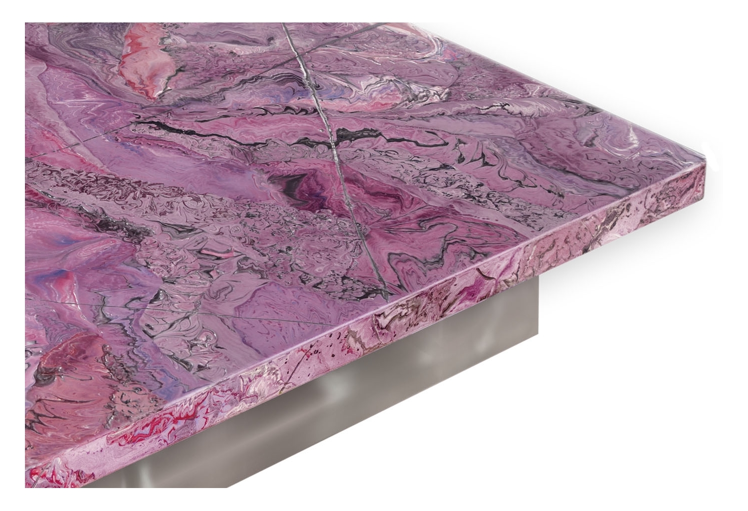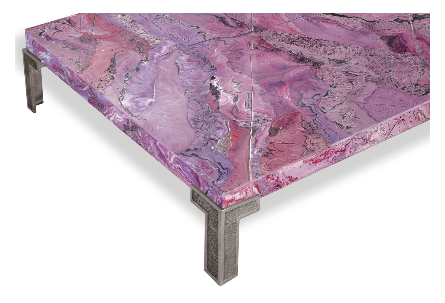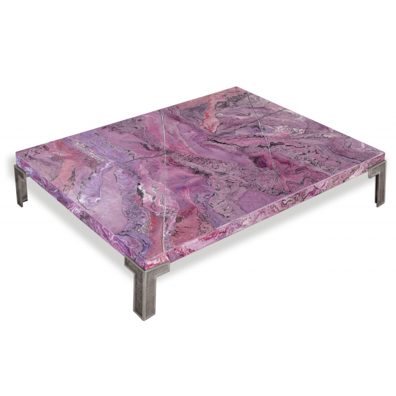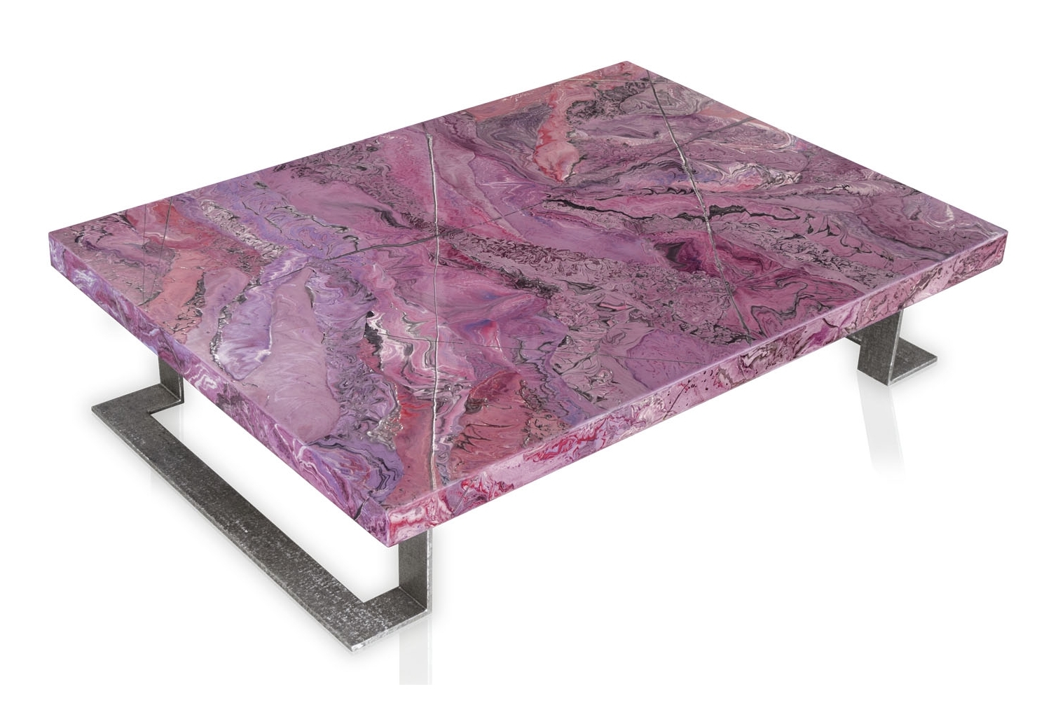 Strahlender Kaffeetisch mit Scaglioa Zierplatte und modernen Metallfüßen. Die tiefen Farbeffekte verändern sich mit jeder Lichtquelle. So bleibt die Oberfläche lebhaft und modern. Im Gegensatz dazu wurden die sachlichen Füßchen ausgewählt. Sie dienen der modernen Funktionalität und sollen den Blick von dem Farbspektrum nicht ablenken.