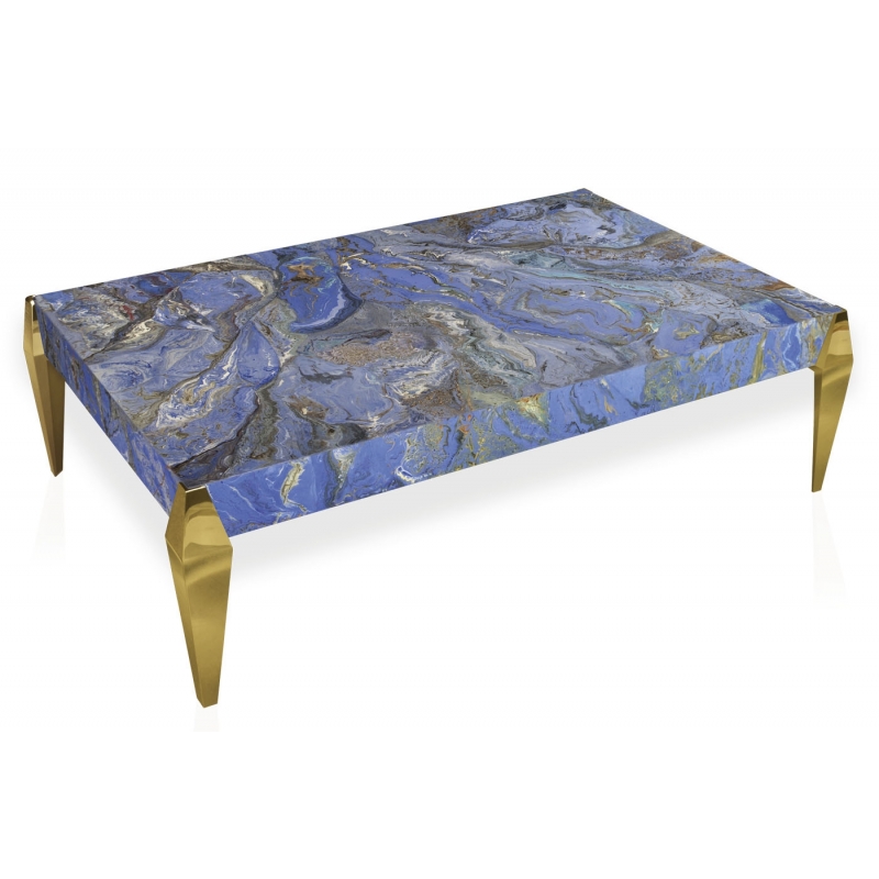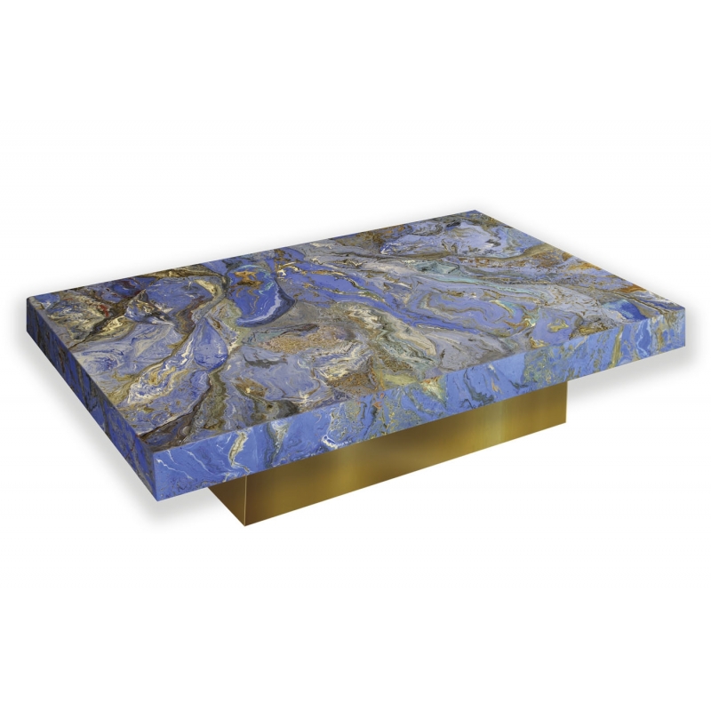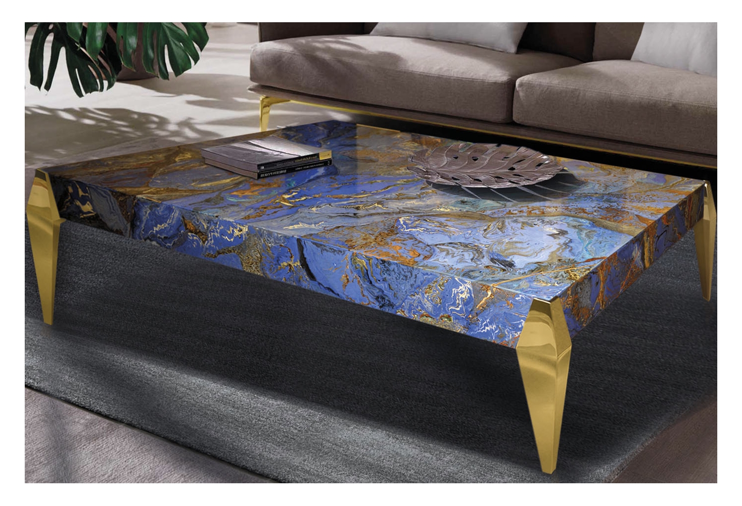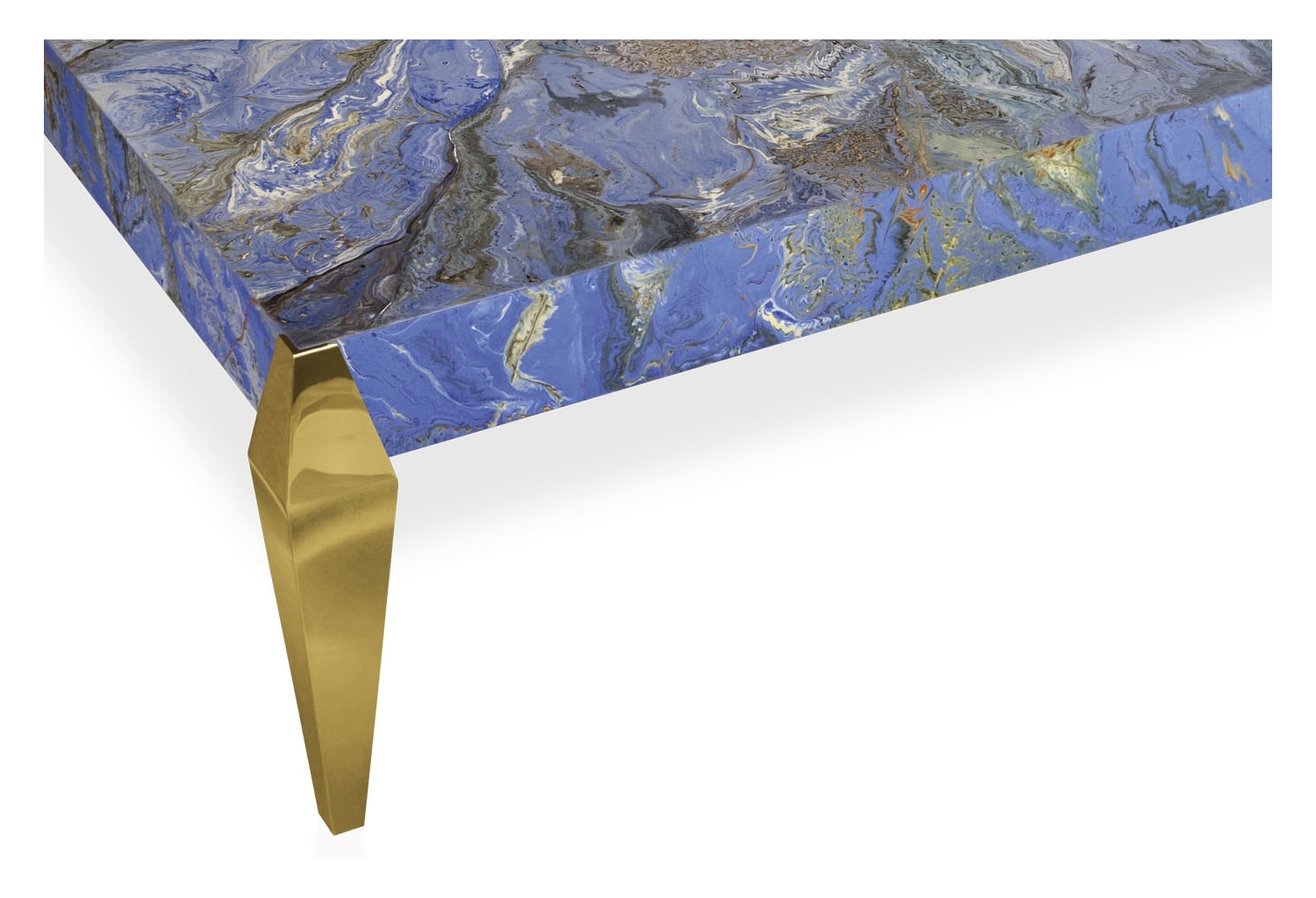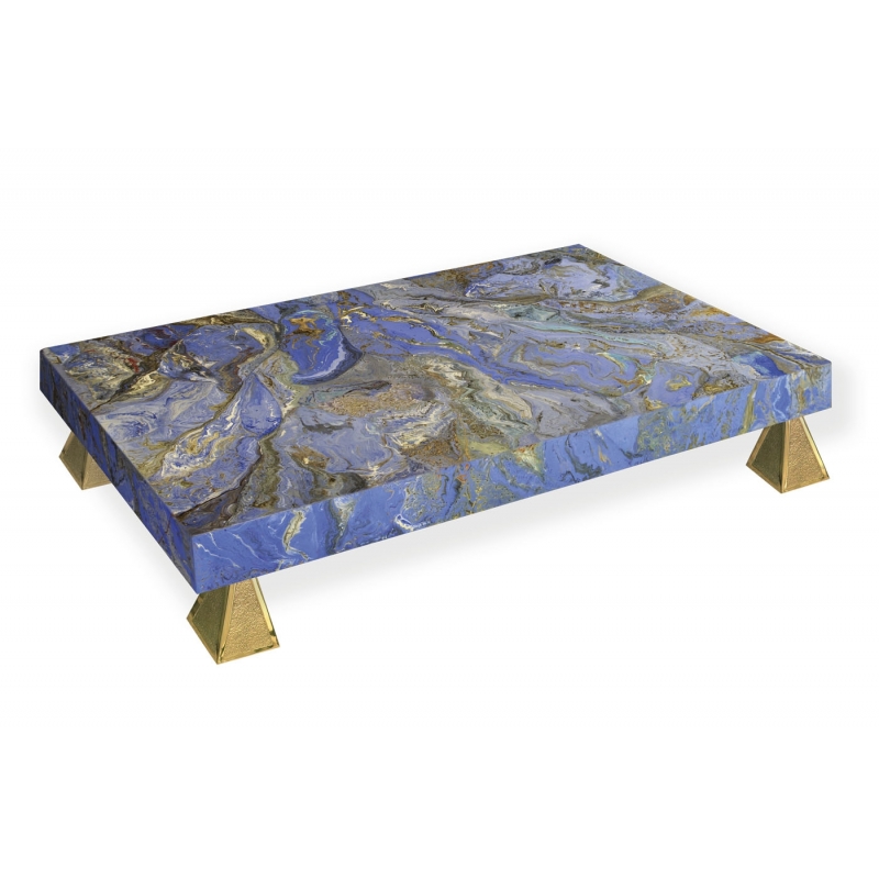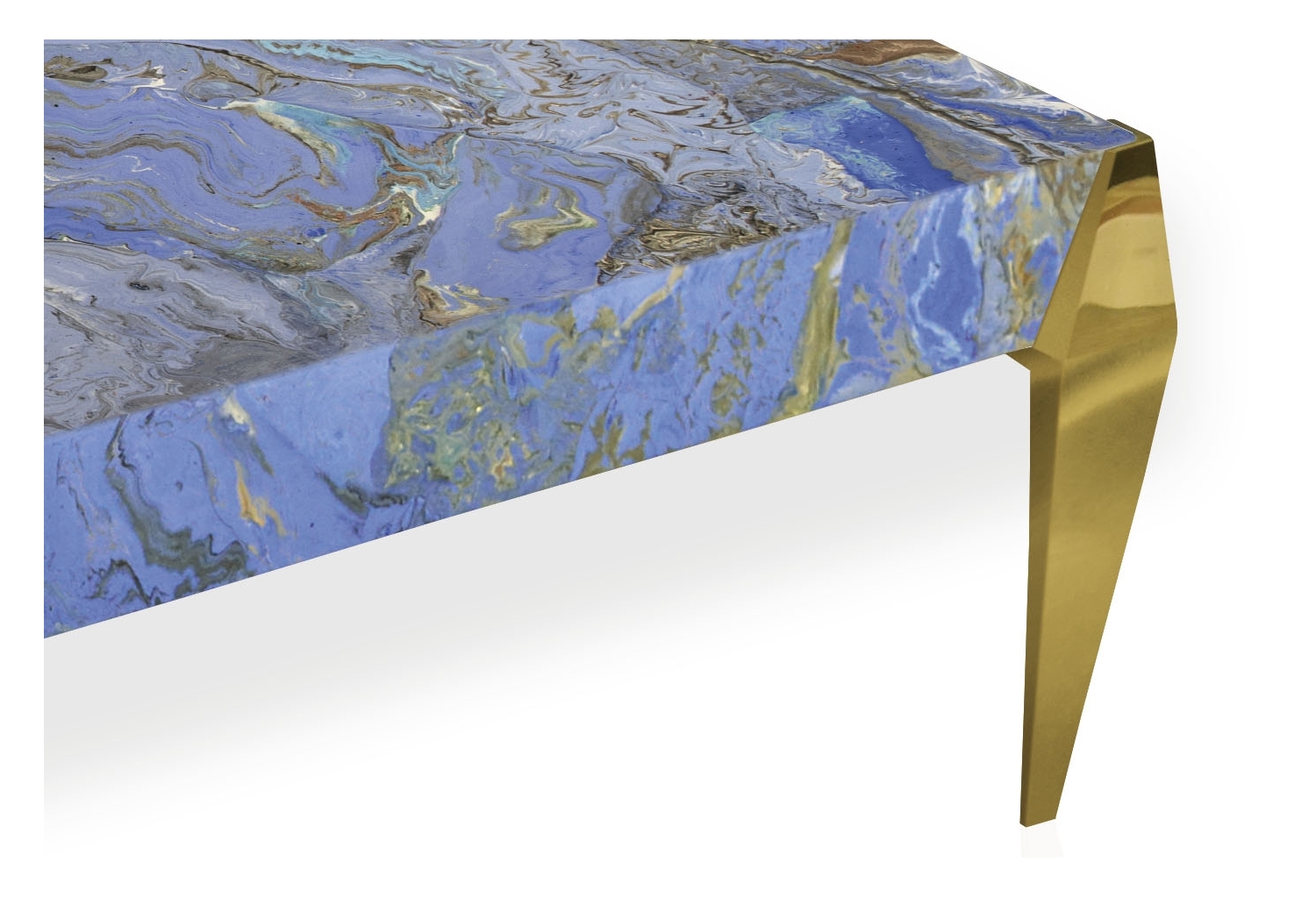 Strahlender Kaffeetisch mit Scagliola Zierplatte und Messingfüßen. Die tiefen Farbeffekte verändern sich mit jeder Lichtquelle. So bleibt die Oberfläche lebhaft und modern. Im Gegensatz dazu wurden die sachlichen Füßchen ausgewählt. Sie dienen der modernen Funktionalität und sollen den Blick von dem Farbspektrum nicht ablenken.