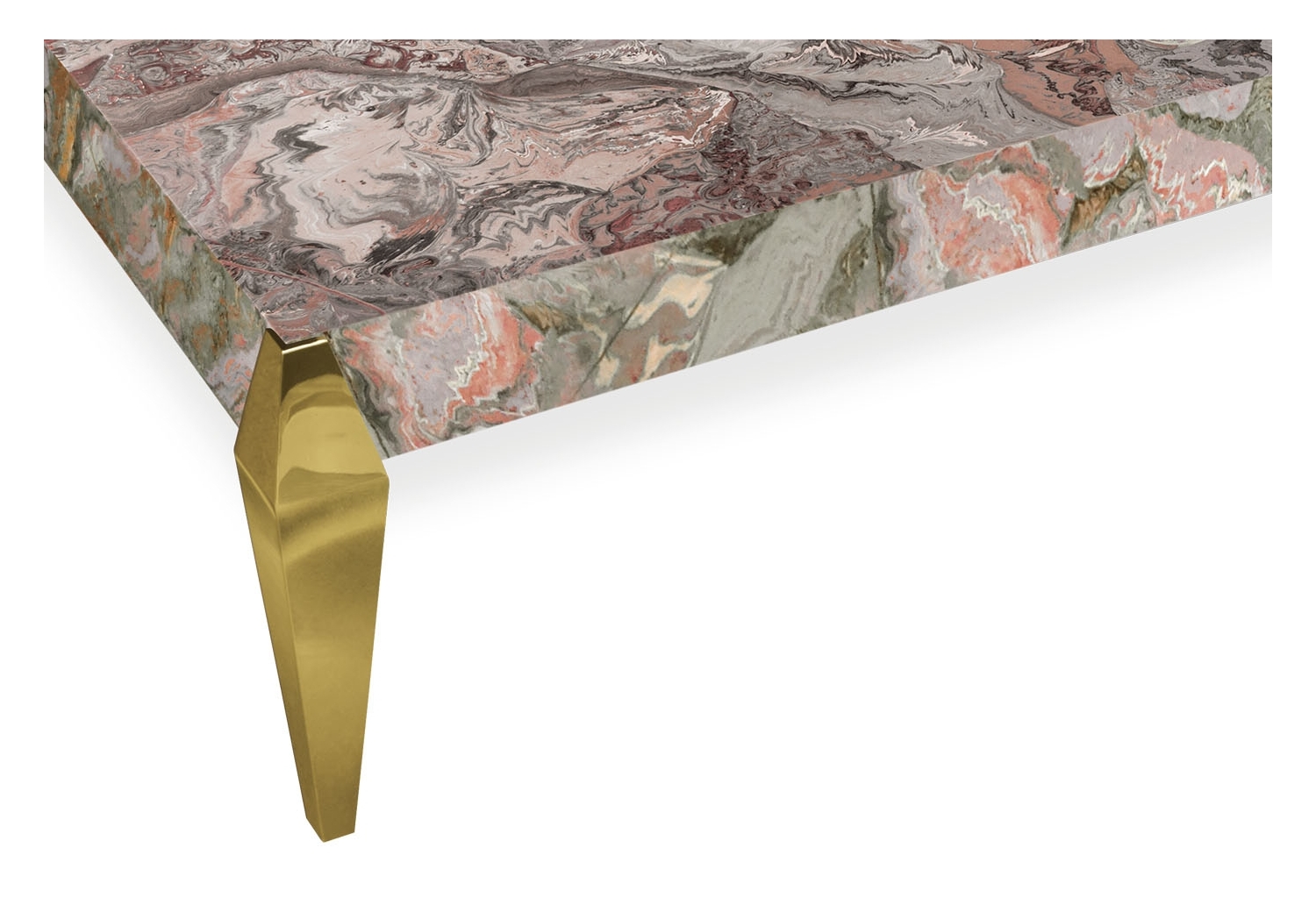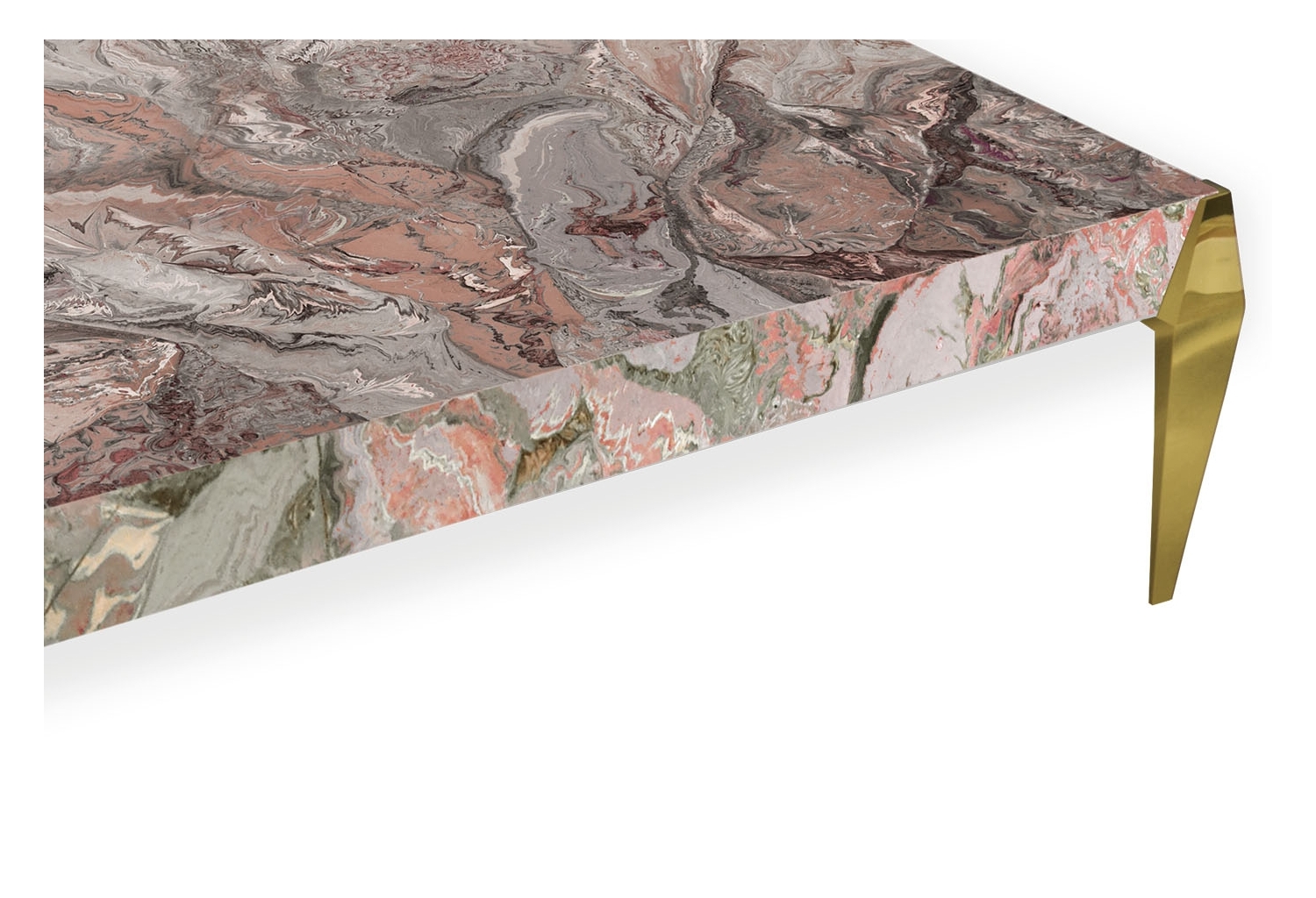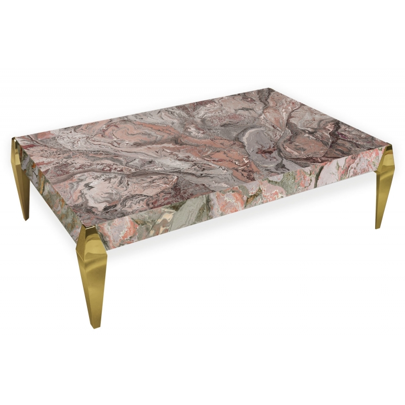 Strahlender Kaffeetisch mit Scaglioa Zierplatte und modernen Metallfüßen. Die tiefen Farbeffekte verändern sich mit jeder Lichtquelle. So bleibt die Oberfläche lebhaft und modern. Im Gegensatz dazu wurden die sachlichen Füßchen ausgewählt. Sie dienen der modernen Funktionalität und sollen den Blick von dem Farbspektrum nicht ablenken.