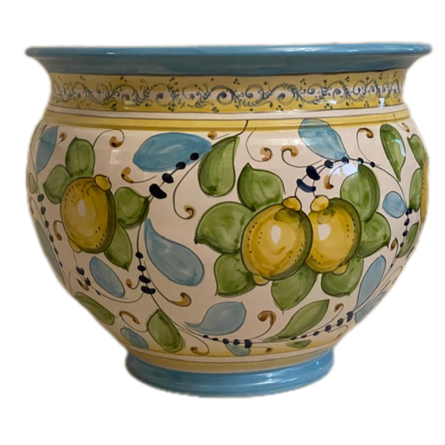 Der Keramikblumentopf zeichnet sich durch seine erdigen Töne aus, die von weichen Beige- und Sandfarben bis zu sanften gelben und Olivnuancen reichen. Die Oberfläche des Topfes ist von Hand mit einem zarten, wellenförmigen Muster verziert, das den Charme der handgemachten Schöpfung unterstreicht. Die Form des Topfes ist klassisch und zeitlos, mit sanft geschwungenen Linien, die eine beruhigende Eleganz ausstrahlen.Der Hintergrund, vor dem der Blumentopf platziert ist, erstrahlt in einem sanften Cremeton. Dieses helle Umfeld schafft einen ruhigen Kontrast, der die gedämpften Farben des Keramiktopfes in den Vordergrund rückt und eine harmonische Gesamtkomposition schafft. Auf der Oberfläche des Blumentopfes sind Zitronen und grüne Blätter in subtilen Schattierungen gemalt. Die Zitronen präsentieren sich in einem zurückhaltenden Gelb, das die Sinne beruhigt und dennoch den frischen Charakter der Früchte einfängt. Ihre Formen sind organisch und leicht stilisiert, wobei einige Zitronen von zarten grünen Blättern begleitet werden.Die grünen Blätter sind in verschiedenen Schattierungen von Oliv und Salbeigrün gemalt. Sie fügen eine beruhigende Natürlichkeit hinzu und setzen einen sanften Kontrast zu den subtilen Erdtönen des Topfes. Die Blätter sind kunstvoll arrangiert, um eine angenehme Balance und visuelle Harmonie zu schaffen.Der Gesamteindruck des Keramikblumentopfes aus der Toskana ist von zurückhaltender Eleganz geprägt. Die gedeckten Farben, das sanfte Muster und die dezenten Motive vermitteln ein Gefühl von Ruhe und zeitloser Schönheit, das charakteristisch für die entspannte Atmosphäre der Toskana ist. Dieser Blumentopf ist eine Verbindung zwischen dem Kunsthandwerk und der Natur, die diese Region so einzigartig macht.