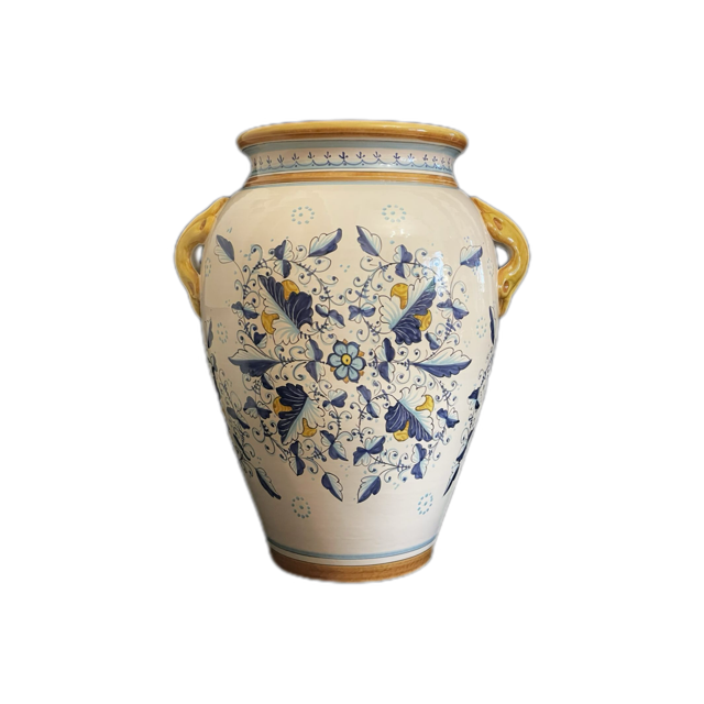 Die Vase ist eine 50 cm hohe, handgefertigte Keramikarbeit aus der Toskana, die mit einem hellen, cremefarbenen Untergrund gestaltet wurde. Im Zentrum ihrer kunstvollen Bemalung steht eine große, leuchtend rote Florentiner Lilie, die mit ihrer markanten Form sofort ins Auge fällt. Umgeben wird die Lilie von üppigen floralen Dekoren, die in intensiven Blau- und Orangetönen gehalten sind und der Vase einen lebhaften, harmonischen Farbkontrast verleihen. Die Details der Malerei zeigen die meisterhafte Handwerkskunst, die für toskanische Keramik bekannt ist, und verleihen der Vase einen Hauch von Eleganz und Tradition. Ein wahres Schmuckstück, das mediterranes Flair in jeden Raum bringt.