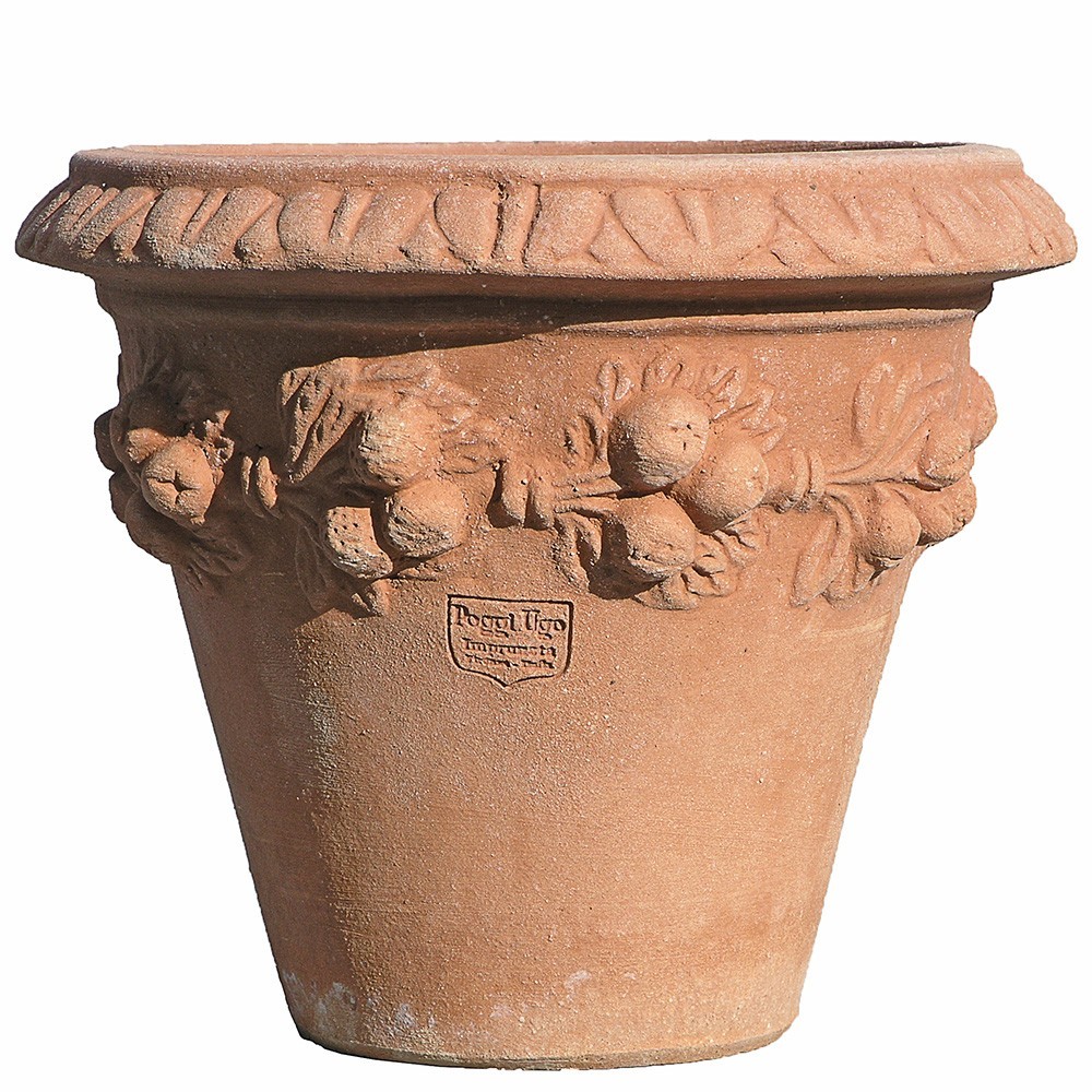 Charmanter, kleiner Pflanztopf aus Impruneta Terracotta. Verziert mit Pflaumendekoration. Frostsicher bis -35°C Hersteller: Poggi Ugo Durchmesser innen 19cm, Höhe 21cm