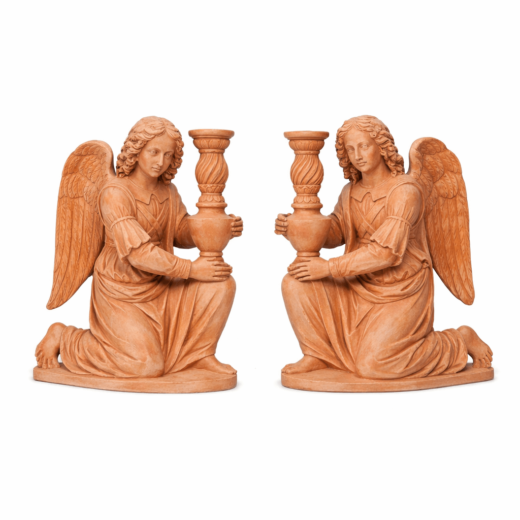 Die Impruneta Terracotta Engel, geschaffen nach dem künstlerischen Vorbild von Luca della Robbia, verkörpern eine eindrucksvolle Verbindung aus Spiritualität, Symbolik und traditioneller Handwerkskunst. In demütiger, kniender Haltung halten die Engel einen Kandelaber in der Hand, während ihre ruhigen Gesichtszüge Andacht, Frieden und innere Einkehr ausstrahlen.