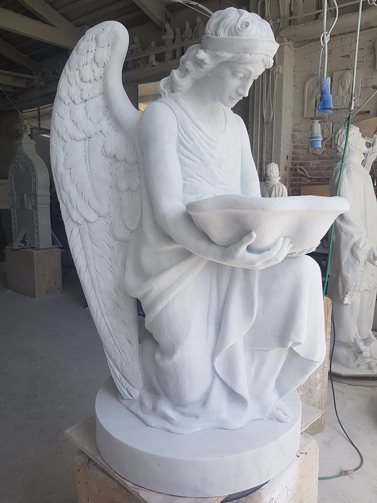 Die Statue strahlt Ruhe und Erhabenheit aus, während sie in einer demütigen Haltung kniet. Die Knie berühren sanft den kühlen Marmorboden, während ihre Flügel leicht nach hinten gespannt sind, als ob sie in einem Moment der Ergebung verweilen würde. In ihren Händen hält der Engel eine Schale, die mit sichtbarer Sorgfalt und Detailtreue gestaltet ist. Die Schale wirkt wie ein Symbol für Hingabe und Anteilnahme, bereit, Trost und Hoffnung zu spenden. Die Oberfläche des Carrara-Marmors reflektiert das einfallende Licht und betont die weichen Konturen der Statue, wodurch eine Atmosphäre der Sanftheit und Transzendenz entsteht. Der Engel selbst scheint mit einem Ausdruck der Zärtlichkeit in die Schale zu blicken. Die Augen strahlen eine ruhige, tröstende Gelassenheit aus, während die Lippen in einem leichten Lächeln verharren, das Trost und Mitgefühl vermittelt. Die Flügel, kunstvoll gemeißelt und mit feinen Details versehen, verleihen der Statue eine himmlische Präsenz. Diese Marmorskulptur eignet sich besonders als Trauerengel auf Friedhöfen, da sie eine Atmosphäre des Friedens und der Verbundenheit schafft. Ihre schlichte Schönheit und die symbolische Darstellung der Schale machen sie zu einem beruhigenden und würdigen Gedenkstück, das die Trauernden an die transzendente Natur der Liebe und des Trostes erinnert.