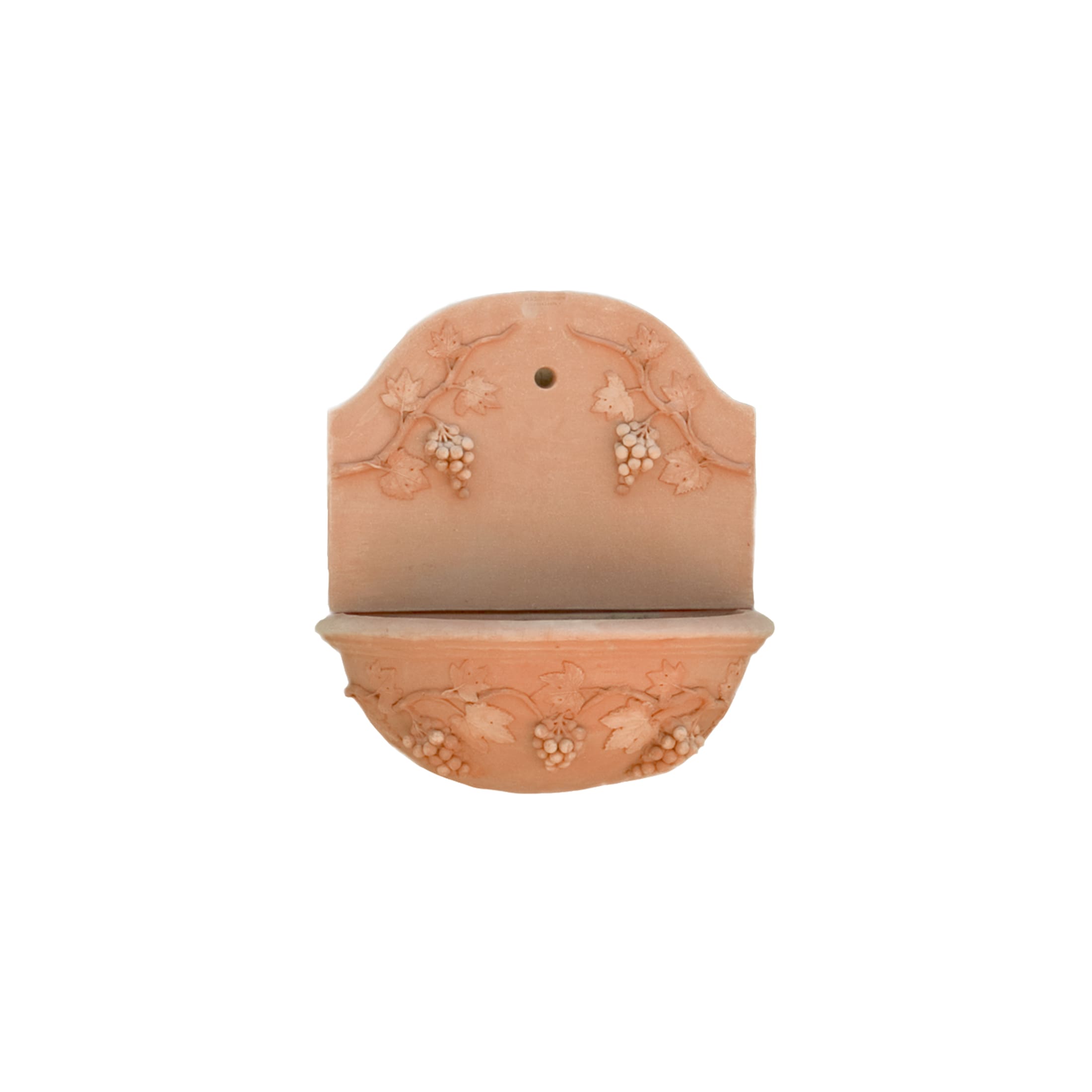 Reich verziertes Terracotta Wandbecken mit Weinranken und floralen Ornamenten.