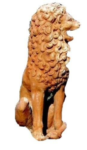 Der Impruneta Terracotta-Löwe in sitzender Haltung ist eine eindrucksvolle Skulptur, die durch ihre majestätische Ausstrahlung und kunstvolle Darstellung fasziniert. Der Löwe ist detailreich und realistisch gestaltet und zeigt eine barocke Mähne sowie ein geöffnetes Maul, was ihm eine fesselnde Ausdruckskraft verleiht.