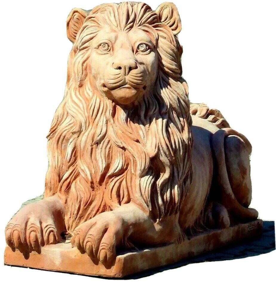 Großer und edler Terracottalöwe, der ein wenig nach links schaut. Es gibt dazu ein Pendant, der nach rechts schaut, somit sind