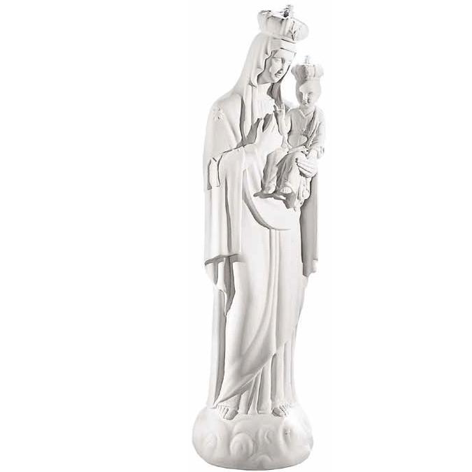 Die Marmor-Statue "Madonna Corona mit Kind" ist ein faszinierendes Kunstwerk, das die Jungfrau Maria mit dem Jesuskind auf ihrem Arm darstellt, wobei beide eine Krone tragen. Diese Darstellung ist ein Symbol der königlichen Würde und der spirituellen Macht, die der Madonna und ihrem göttlichen Kind zugeschrieben wird. Die Statue zeigt die Madonna in einer majestätischen Haltung, mit einem Ausdruck der Sanftmut und Erhabenheit auf ihrem Gesicht. Sie hält das Jesuskind liebevoll in ihren Armen, wobei er oft eine Hand zum Segen erhoben hat oder eine symbolische Geste ausführt. Der Marmor, aus dem die Statue gefertigt ist, verleiht ihr eine zeitlose Schönheit und Eleganz. Jedes Detail, von den feinen Gesichtszügen bis hin zu den Falten ihrer Gewänder, ist kunstvoll gemeißelt und vermittelt eine Aura von Heiligkeit und Transzendenz. Sowohl die Madonna als auch das Jesuskind tragen Kronen auf ihren Häuptern, was ihre königliche Stellung und ihre besondere Beziehung zu Gott unterstreicht. Die Kronen sind kunstvoll gestaltet und können mit filigranen Verzierungen oder Edelsteinen geschmückt sein, die ihre göttliche Herrschaft und Autorität symbolisieren. Die Statue "Madonna Corona mit Kind" ist nicht nur ein beeindruckendes Kunstwerk, sondern auch ein Symbol des Glaubens und der Verehrung für Gläubige auf der ganzen Welt. Sie lädt dazu ein, in Ehrfurcht zu verweilen und sich der göttlichen Liebe und Barmherzigkeit bewusst zu werden, die durch die Figur der Madonna und ihres göttlichen Kindes verkörpert werden.
