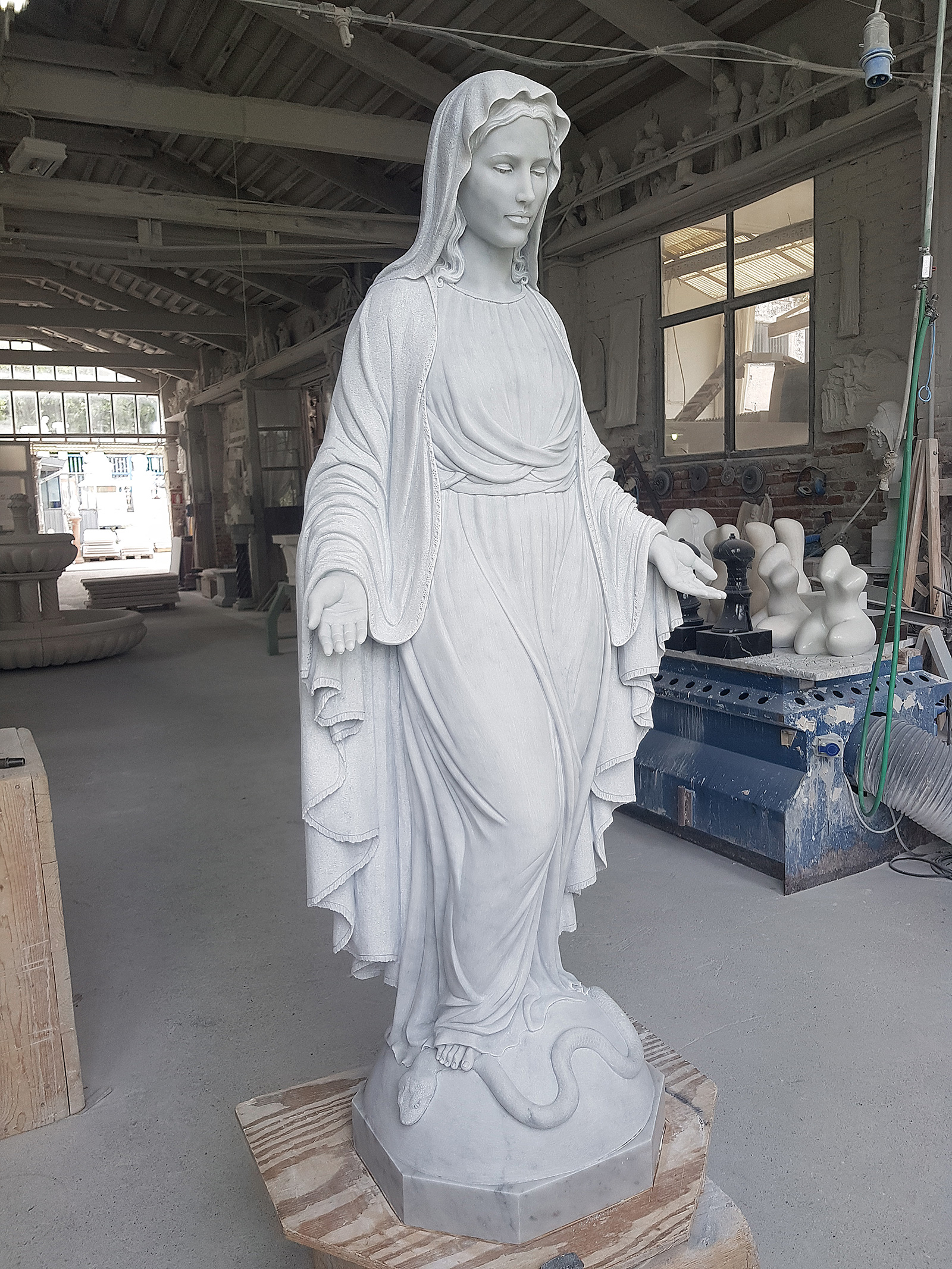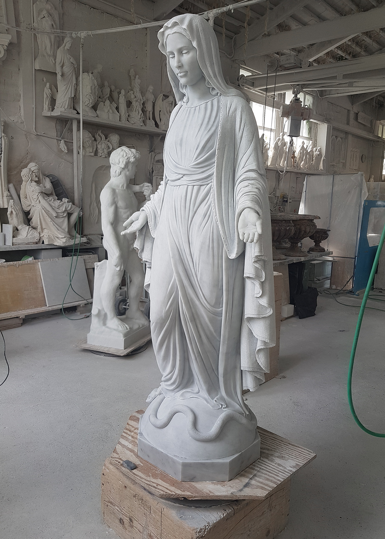 Die Madonna aus Carrara Marmor ist eine beeindruckende Darstellung von Anmut und spiritueller Erhabenheit. Ihr sanftes Gesicht strahlt Güte und Mitgefühl aus, während die feinen Details der Bildhauerei die Züge der Madonna mit einer fast lebensechten Präzision einfangen. Der Carrara Marmor, berühmt für seine helle Farbe und geschmeidige Textur, verleiht der Skulptur eine zeitlose Eleganz. Die Madonna steht majestätisch, gehüllt in edle, fließende Gewänder, die kunstvoll drapiert sind und eine Anmut ausstrahlen, die über die materielle Welt hinausgeht. Die Gewänder fallen in weichen Falten und verleihen der Statue eine dynamische Bewegung, als ob sie von einem unsichtbaren Hauch des Göttlichen umgeben wäre. Unter den Füßen der Madonna windet sich eine Schlange, ein Symbol für den Sieg über die Erbsünde. Die Schlange, die oft mit dem biblischen Motiv der Vertreibung aus dem Paradies in Verbindung gebracht wird, wird hier von der Madonna überwunden und symbolisiert somit den Triumph des Guten über das Böse. Die stolze Haltung der Madonna, während sie auf der Schlange steht, unterstreicht ihre Rolle als Vermittlerin zwischen Himmel und Erde. Die Madonna aus Carrara Marmor ist nicht nur eine Skulptur, sondern auch ein Ausdruck von Glauben, Hoffnung und Erlösung. Ihre Präsenz strahlt Ruhe und Erhabenheit aus und erinnert die Betrachter an die spirituelle Bedeutung und Schönheit, die durch die Kombination von Kunst und feinstem Marmor geschaffen wurde.