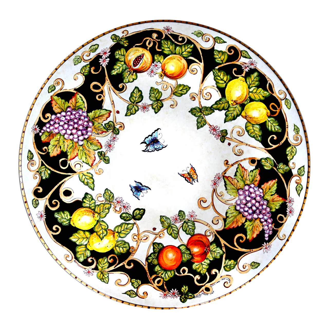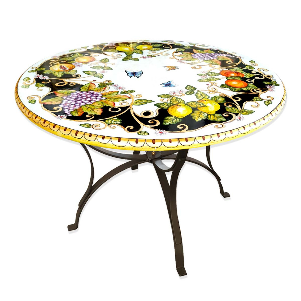 Der Tisch ist eine kunstvolle Darstellung im typischen Majolika-Stil aus Umbrien. Die Tischplatte zeigt ein reich verziertes Arrangement, das von einem lebhaften Motiv aus Weintrauben, Zitronen und Granatäpfeln dominiert wird. Die Früchte wirken beinahe lebendig, ihre Farben leuchtend und von natürlichem Glanz, der durch geschickte Glasurtechniken verstärkt wird.