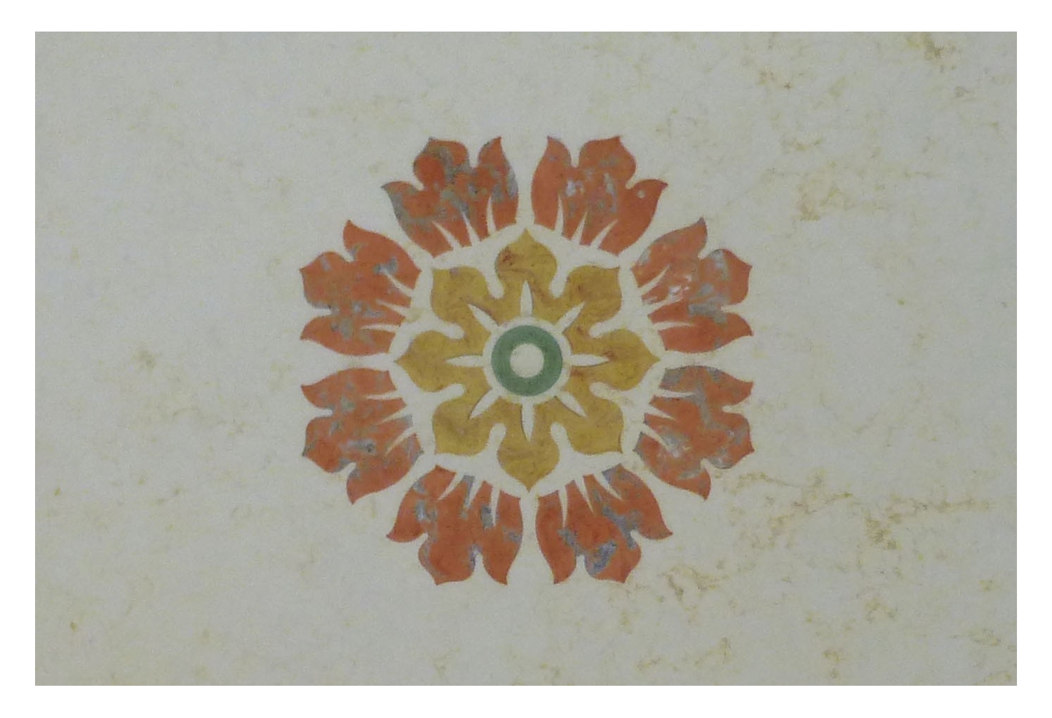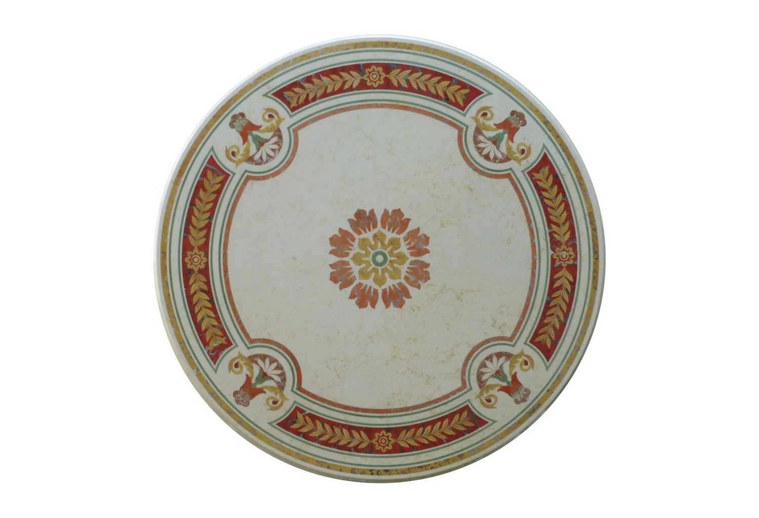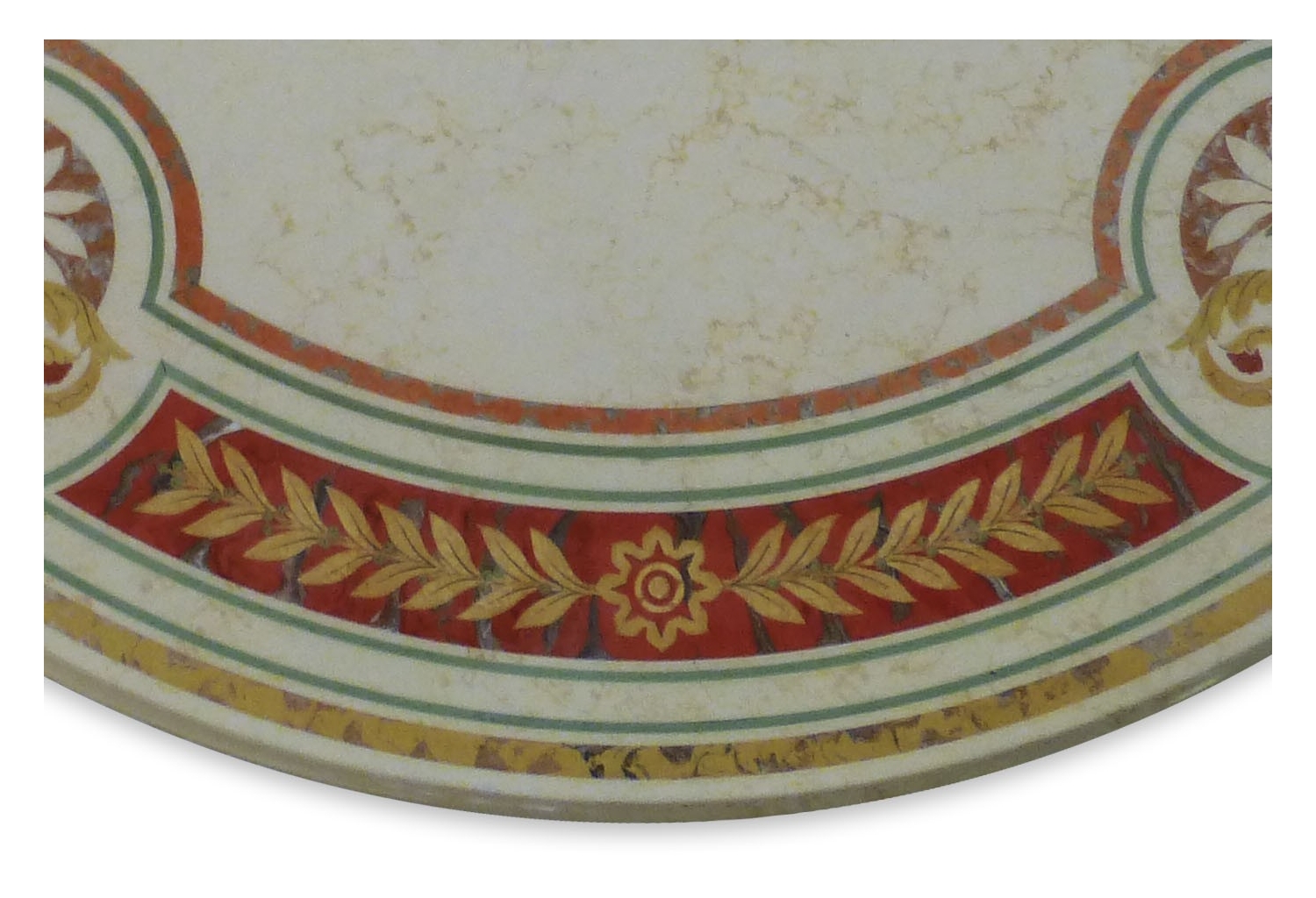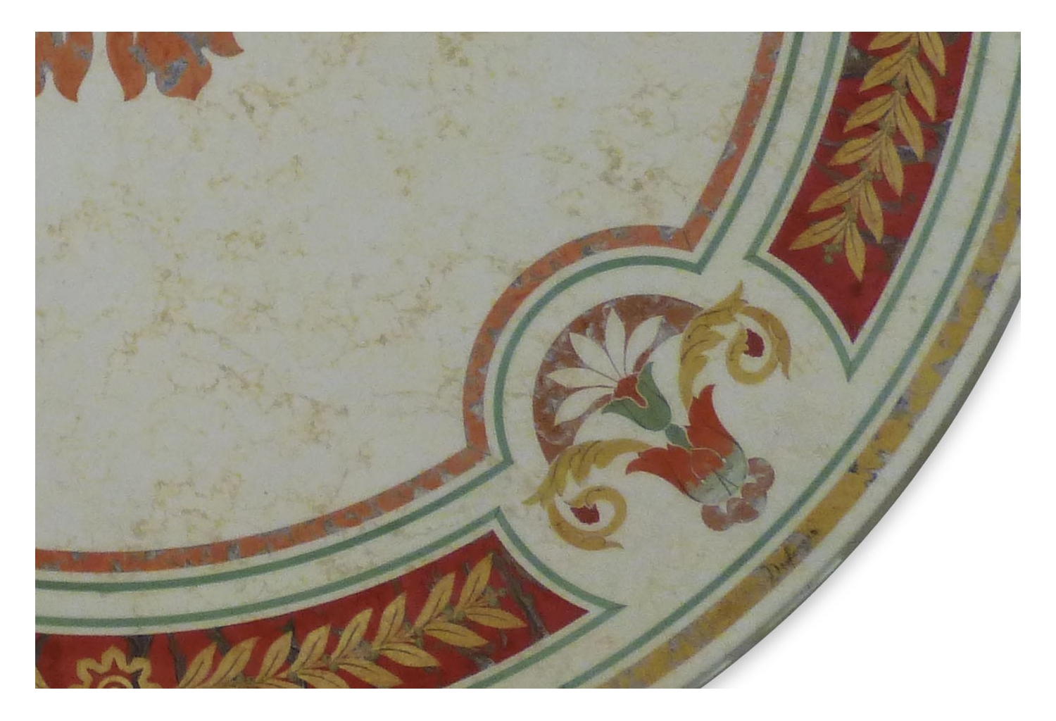 Cremefarbene dekorative Marmorplatte mit klassischem floralem Motiv. Eingearbeitet in vollendeter Scagliolatechnik st ein meisterhaftes Mosaik mit Blätterm und Ornamenten. Handgearbeitet Edles Dekorstück aus dem traditionellen Florenz. Diese Platte kann als Tischplatte oder als Wanddekor verwendet werden.
