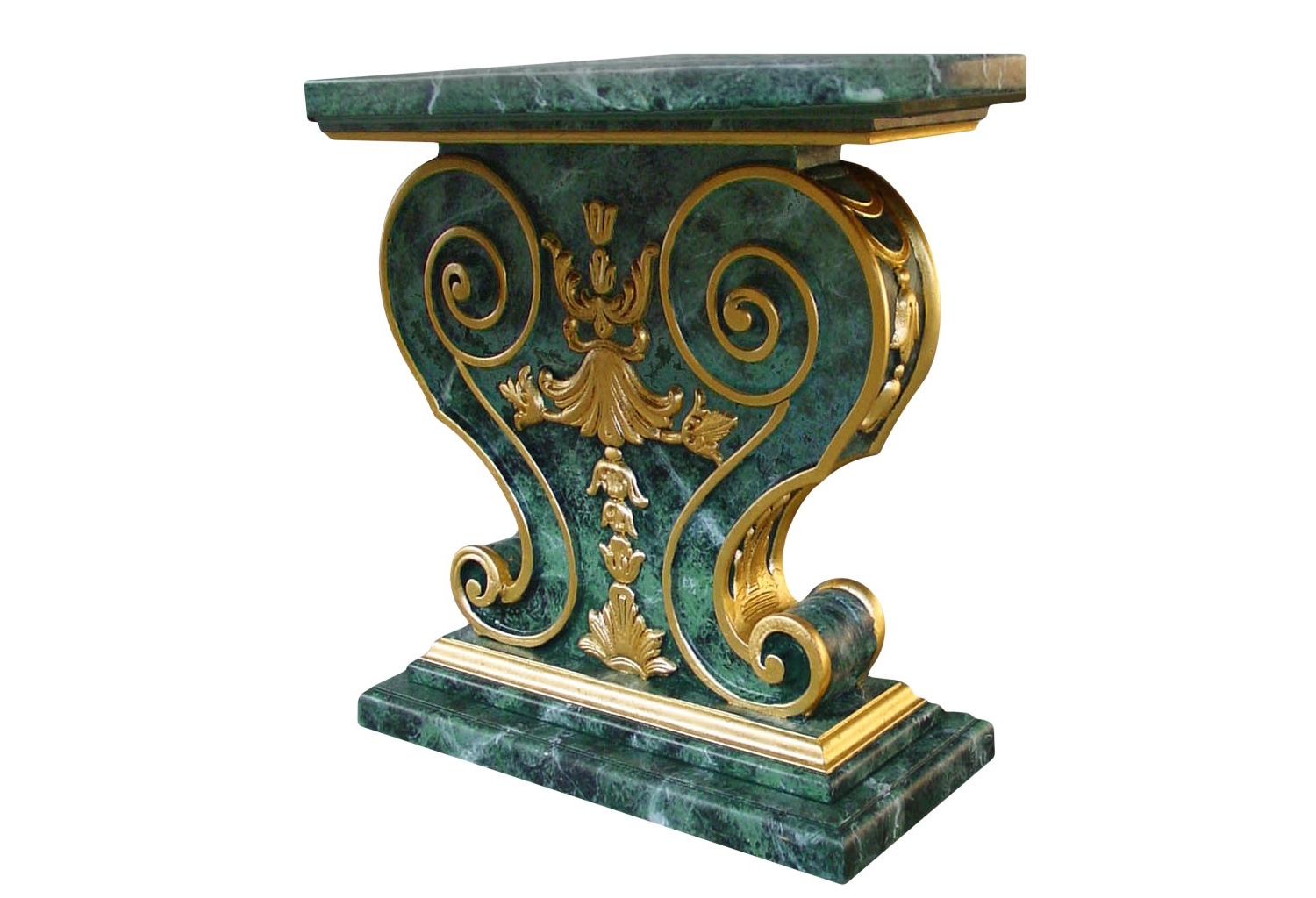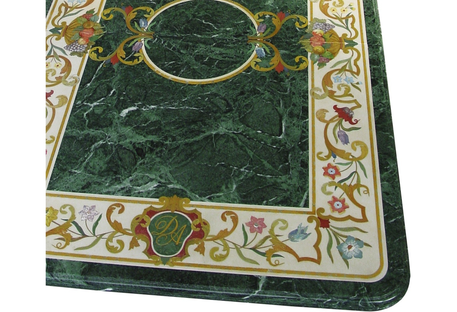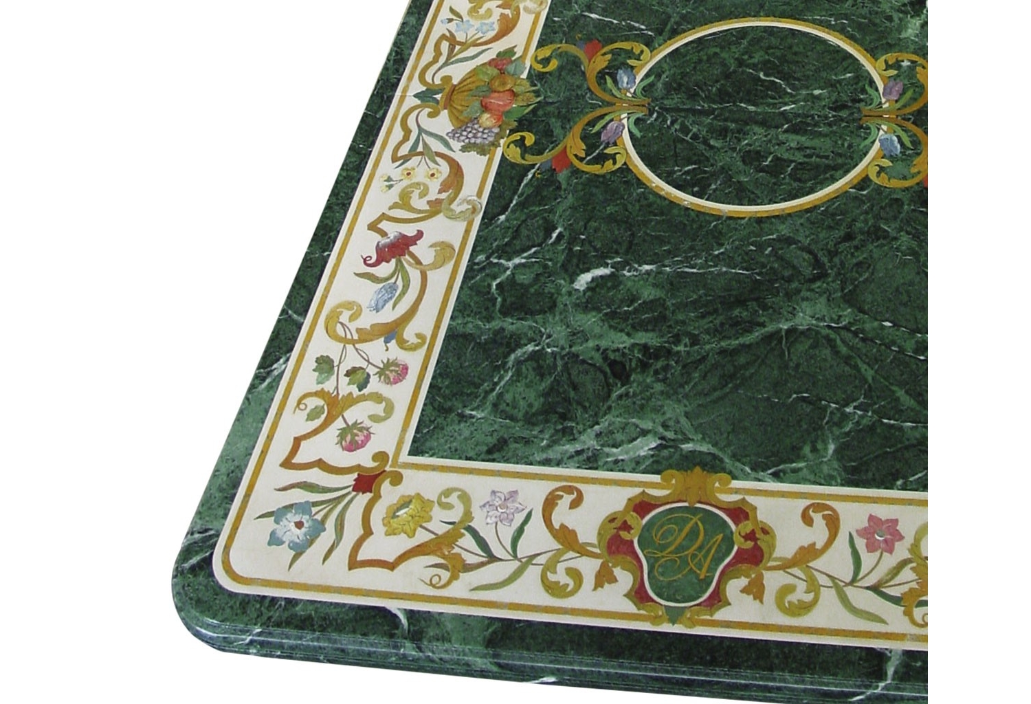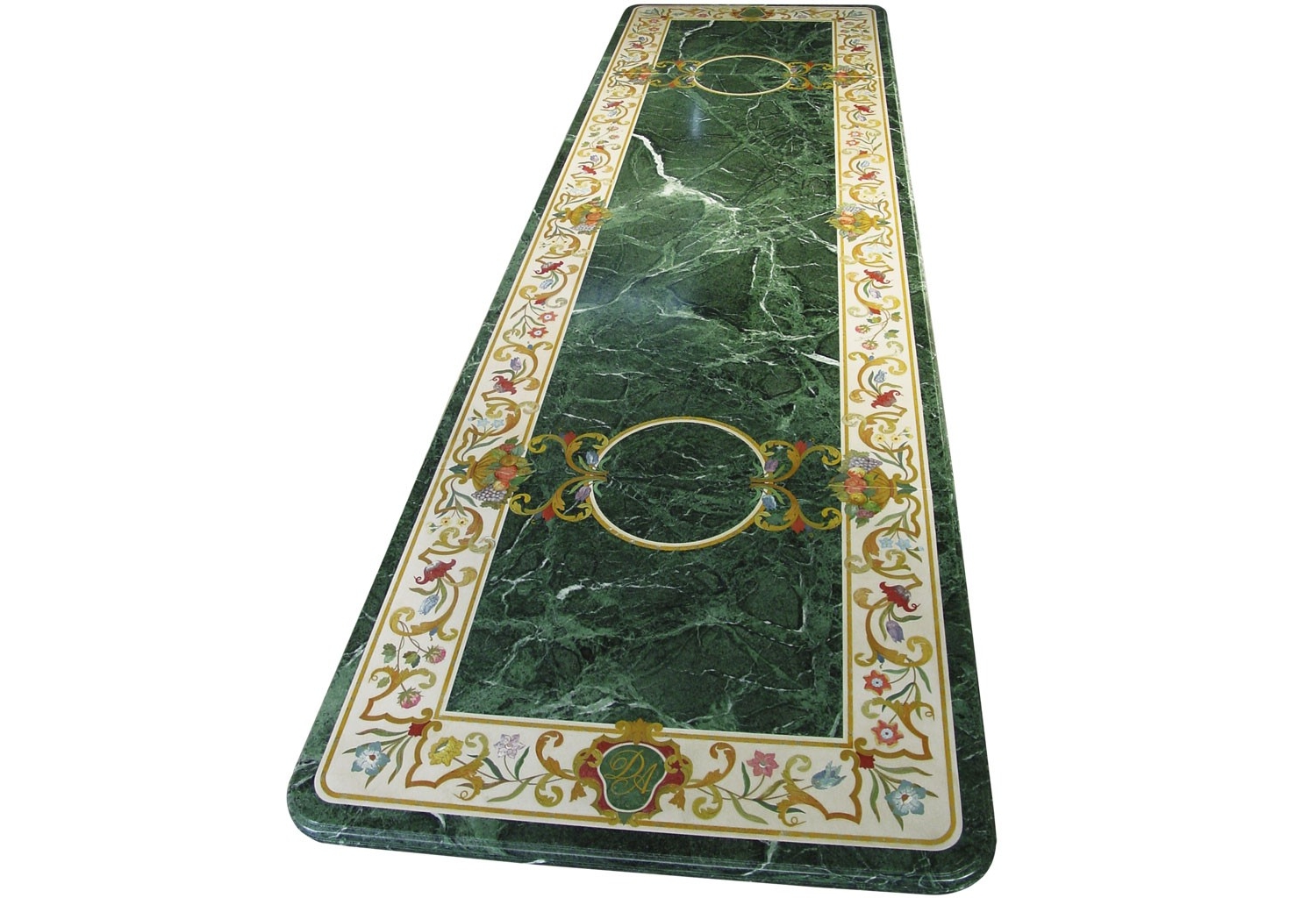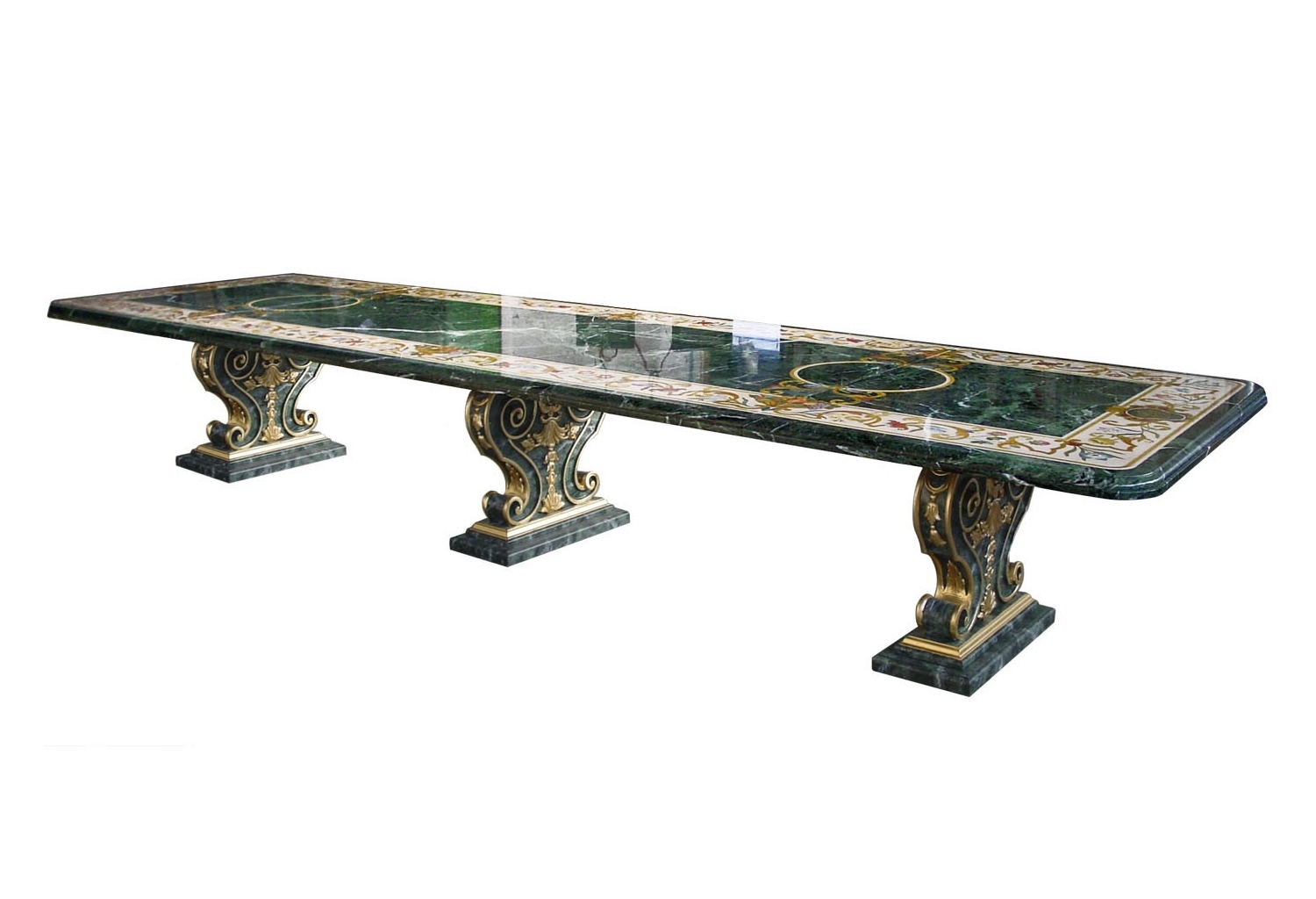 Gigaro ist ein riesiger Esstisch aus 4 grünen Marmoplatten gefertigt und verziert mit Scagliola Intarsien. Eingearbeitet ist ein edles Muster mit Blumen, Obstkörben und Wappen, eine Vorlage aus dem XVIII. Jahrhundert. Die Tischfüße bestehen aus Holz, verziert mit Blattgold. Scagliola ist die antike Kunst, architektonische Elemente aus Stuck herzustellen, die wie Marmor aussehen. Diese Technik erlangte im 18. Jahrhundert in Florenz und Venedig einen hohen Bekanntheitsgrad. Hergestellt wird eine dekorierte Marmorplatte, die mit farblich strahlenden Intarsien gefüllt wird. Somit entsteht eine schimmernde von innen heraus scheinende Wirkung, die langfristig strahlend bleibt.