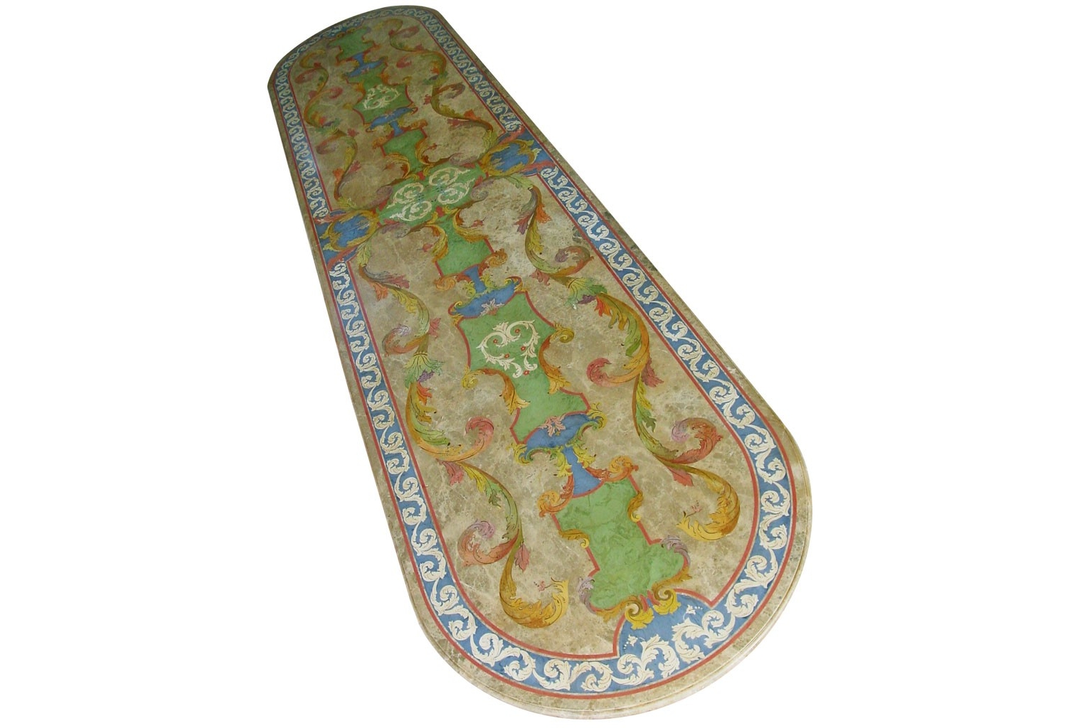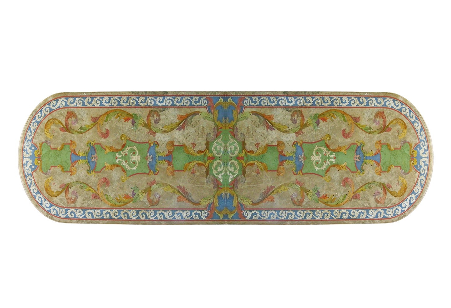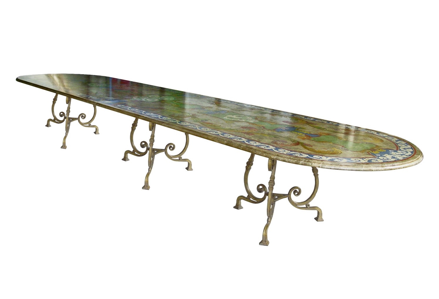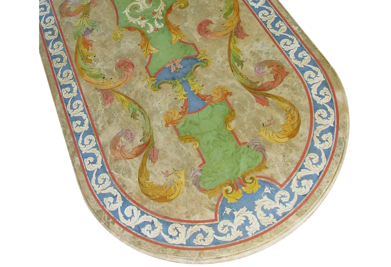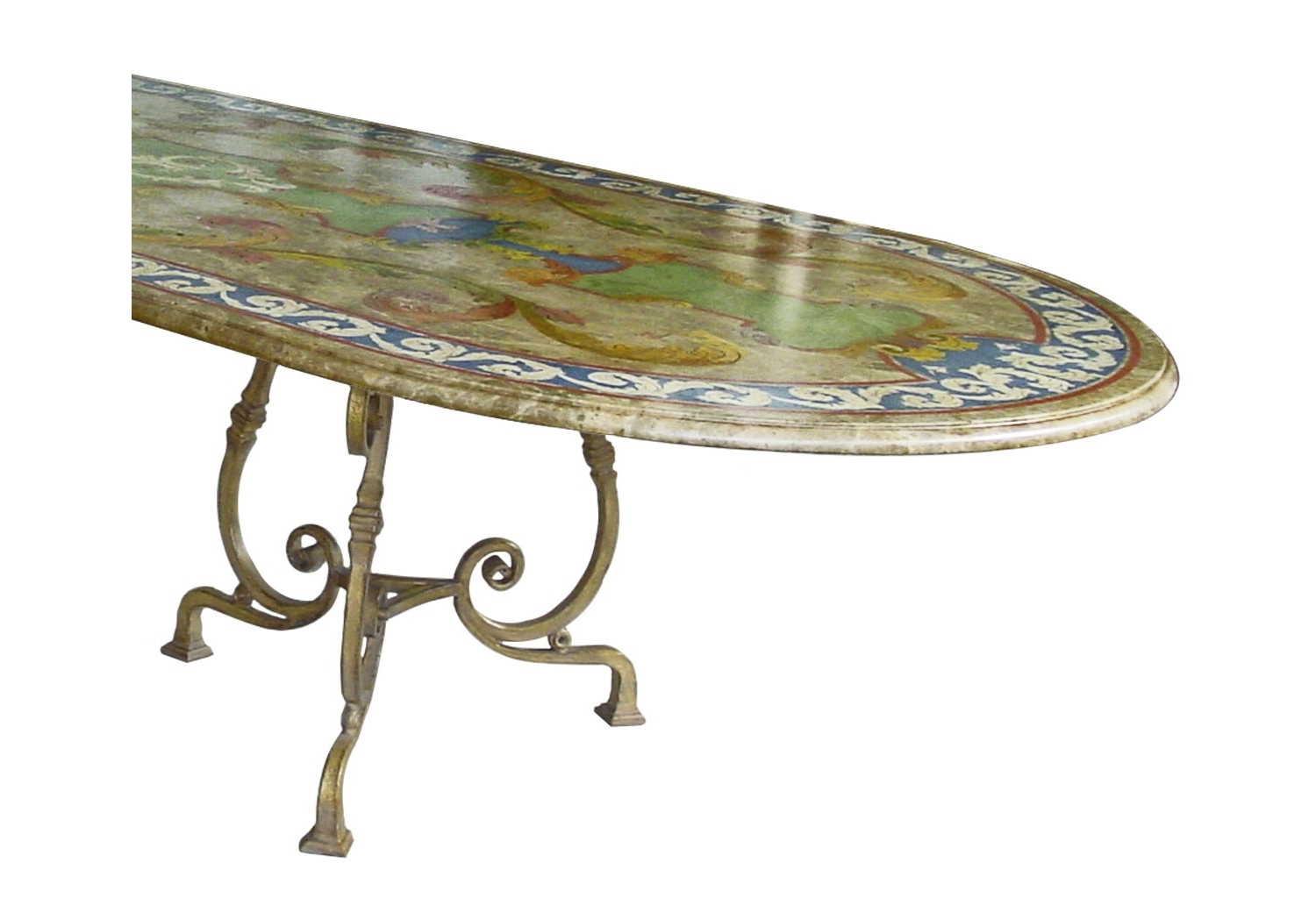Esstisch mit Marmorplatte und polychromen Scagliola Intarsien. Die Tischfüße bestehen aus vergoldetem Schmiedeeisen. Scagliola ist die antike Kunst, architektonische Elemente aus Stuck herzustellen, die wie Marmor aussehen. Diese Technik erlangte im 18. Jahrhundert in Florenz und Venedig einen hohen Bekanntheitsgrad. Hergestellt wird ein Marmorimitat, was mit farblich strahlenden Intarsien gefüllt wird. Somit entsteht eine schimmernde von innen heraus scheinende Wirkung, die strahlend bleibt.