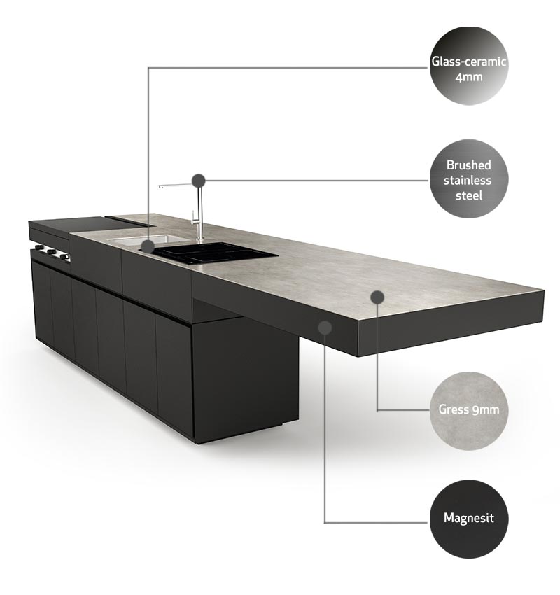 Als kombinierbare Module stehen optional folgende Komponenten zur Auswahl: Grill, Spüle, Induktionsherd, neutrale Arbeitsplatte. Als weitere Option ist es möglich, folgendes Zubehör hinzuzufügen: Weinkühlschrank, Eismaschine, Minibar-Kühlschrank und Beleuchtungsset.