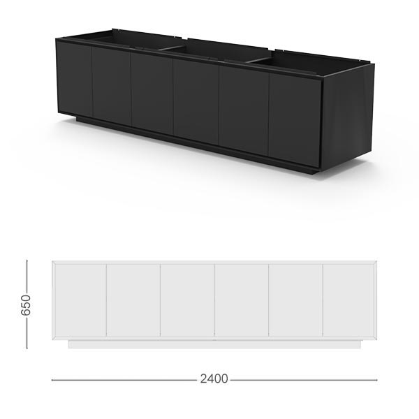 Die 3er Kombination Tikal mit drei Modulen verbindet topmodernes Grillen und Kochen im Freien. Sie misst 240x60cm und ist mit einer schwarzen RAL 9004 Hochtemperatur-Strukturlackierung versehen, die speziell für den Außenbereich vorgesehen ist.