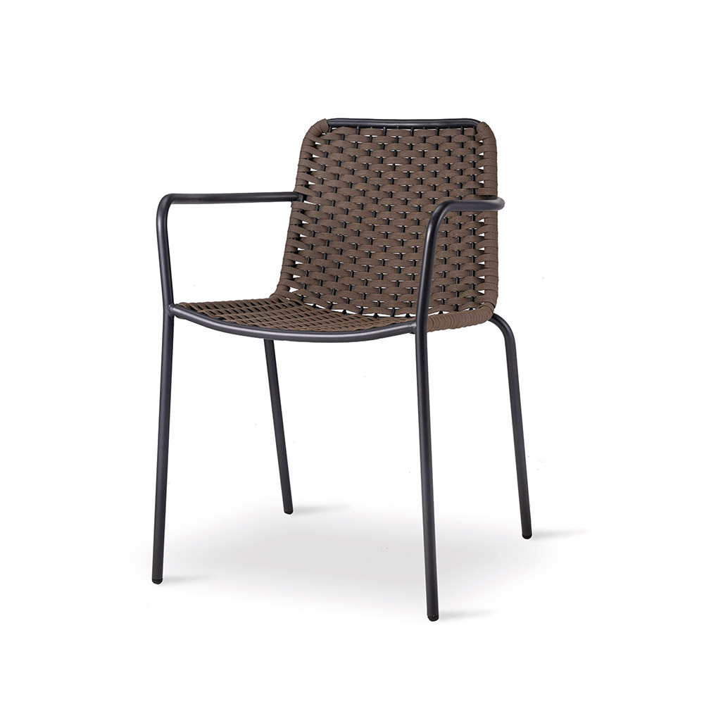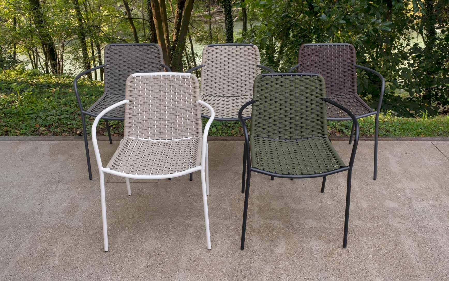 Moderner Stuhl mit Armlehne aus weiß anthrazit lackiertem Stahl mit strapazierfähigem Gummiseil und Textilhülle im topmodernem Seil Design (Rope Optik)