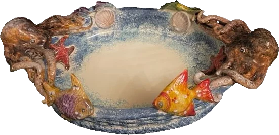 Die ovale Dekorationsschale aus der Toskana ist ein handbemaltes Meisterwerk, das die lebendige Schönheit des Mittelmeers einfängt. Mit kunstvoll gestalteten Abbildungen von Tintenfischen, Muscheln und Fischen verziert, wirkt die Schale wie ein kleines Fenster in die Unterwasserwelt des Meeres. Jeder Tintenfisch ist mit fein gemalten Tentakeln versehen, die in geschwungenen Linien dargestellt sind und so eine fließende Dynamik erzeugen. Die Muscheln sind in natürlichen Farbtönen gehalten, von warmen Beigetönen bis zu zarten Rosatönen, und zeigen kleine, detaillierte Rillen, die ihnen eine authentische Textur verleihen.