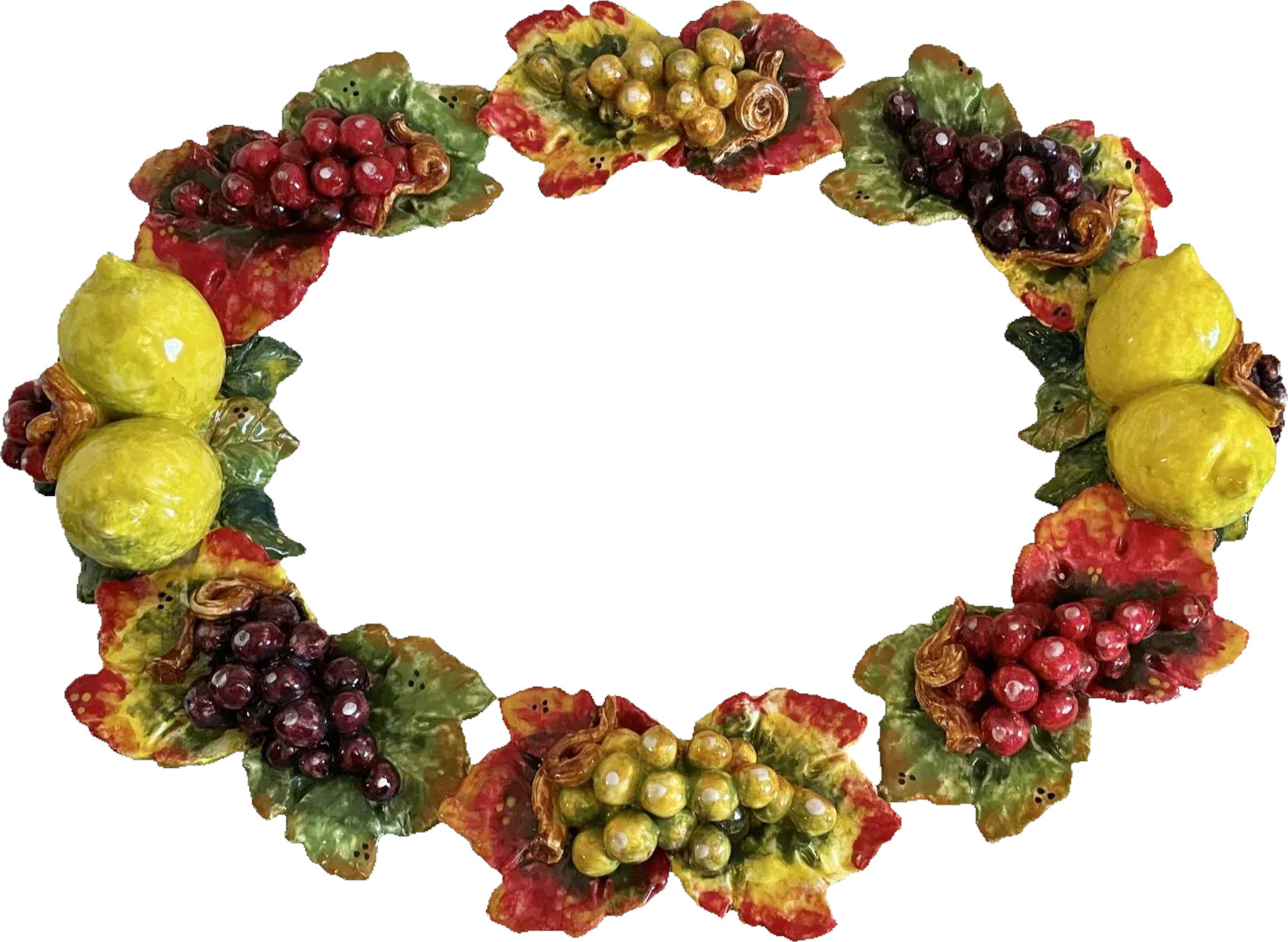 Die ovale Tischdekoration aus Keramik aus der Toskana verkörpert das mediterrane Lebensgefühl und handwerkliches Können. Der Teller ist von Hand bemalt und zeigt ein lebhaftes Motiv mit Zitronen und Trauben – typisch für die Region. Die warmen Gelbtöne der Zitronen und die satten Lila- und Blautöne der Trauben wirken harmonisch auf dem meist creme- oder terracottafarbenen Hintergrund.