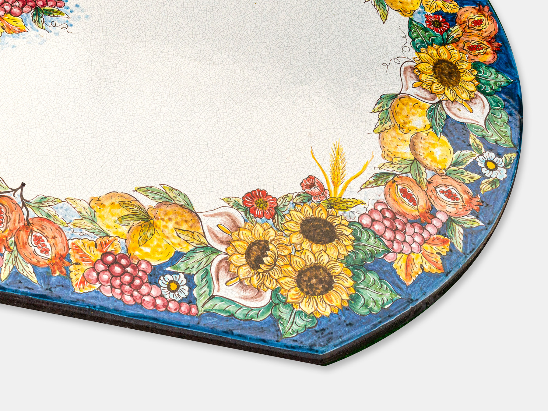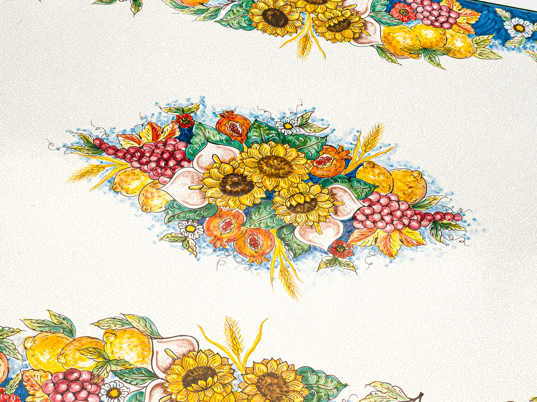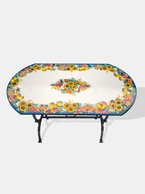 Der ovale Gartentisch aus Lavastein ist ein wahres Kunstwerk der Natur, kunstvoll verziert mit Motiven von Trauben, Sonnenblumen, Zitronen und Granatäpfeln. Das farbenfrohe Muster bildet einen lebhaften Rahmen um den hellen Tisch und schafft eine lebendige Atmosphäre. In der Mitte des Tisches ist das passende bunte Dekor gemalt, das sicherlich die Blicke auf sich zieht und einen Hauch von mediterranem Flair verströmt.