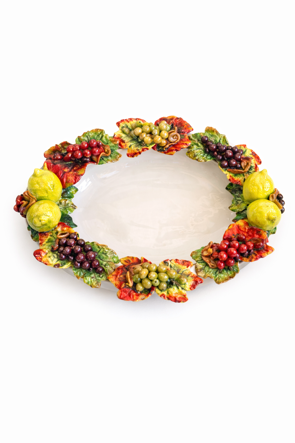 Im Zentrum entfalten die handbemalten Früchte ihre volle Ausdruckskraft. Trauben in schimmernden Rotnuancen und Zitronen in leuchtendem Gelb setzen einen harmonischen Kontrast zum strahlend weißen Porzellan. Durch feine Lichtreflexe, sanfte Schattierungen und detailreich ausgearbeitete Blätter entsteht eine naturgetreue Darstellung, die mediterrane Fülle, Frische und Lebensfreude vermittelt.