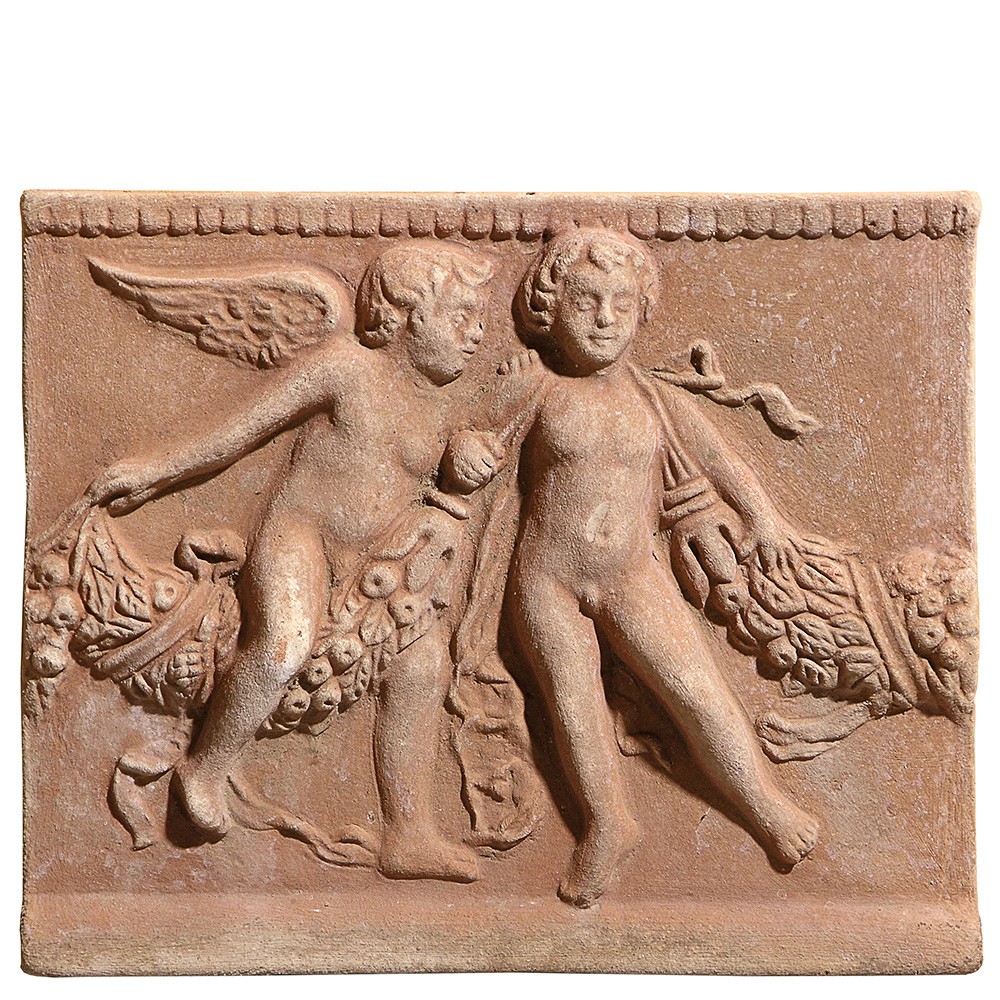 Jedes Reliefteil wird vollständig von Hand gearbeitet und sorgfältig hinterschnitten, sodass lebendige Tiefenwirkung und feine Details entstehen. Die charakteristische Terracotta aus Impruneta verleiht dem Motiv eine warme, mediterrane Ausstrahlung. Florale und dekorative Elemente umrahmen die Figuren und verstärken die Leichtigkeit und Harmonie der Szene.