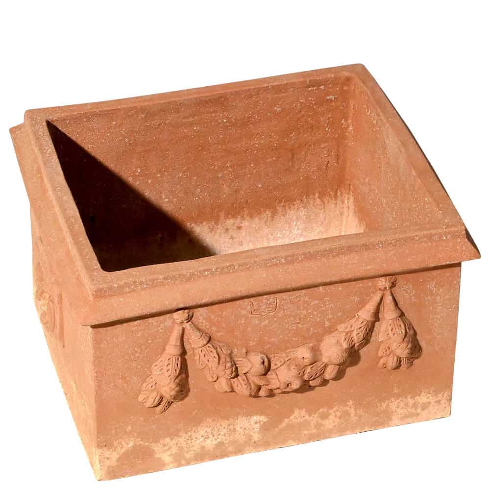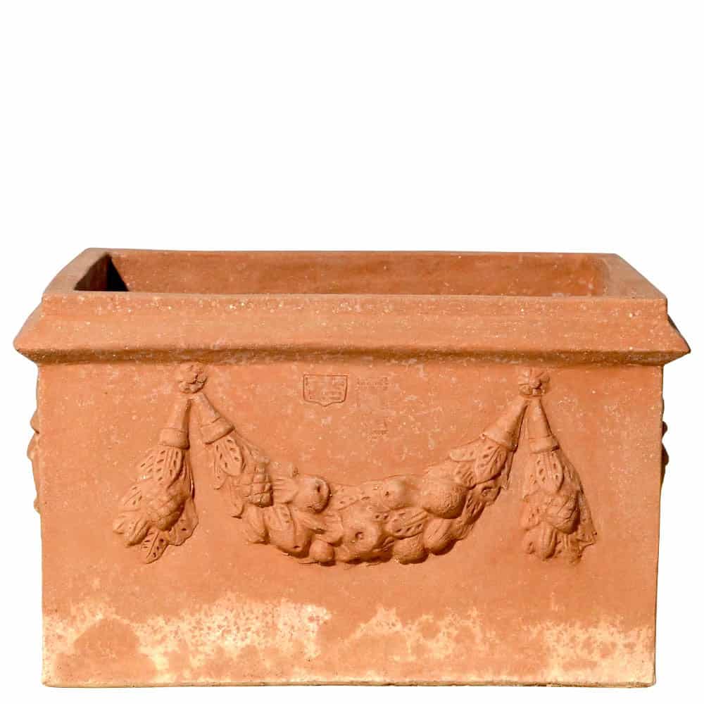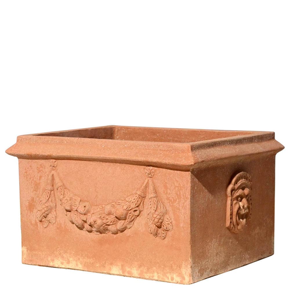 Ob als stilvoller Rahmen für Pflanzenarrangements oder als dekoratives Objekt an sich – dieser Terracottakasten verbindet künstlerische Verzierungen mit praktischer Funktionalität und bringt ein Stück toskanischer Kultur in Ihren Garten, auf die Terrasse oder in den Innenhof.