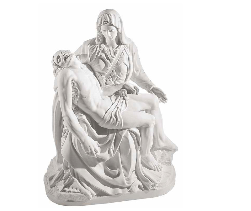 Die Pietà nach Michelangelo zeigt die Jungfrau Maria, die den leblosen Körper Jesu Christi nach seiner Kreuzigung in ihren Armen hält. Maria ist in einer anmutigen und zugleich schmerzvollen Pose dargestellt, mit ihrem Kopf leicht geneigt und einem Ausdruck der Trauer und des Leidens auf ihrem Gesicht. Ihre linke Hand stützt den Körper Jesu sanft, während ihre rechte Hand möglicherweise eine subtile Geste der Verzweiflung oder der Resignation zeigt. Der Körper Jesu Christi ruht in Marias Armen, sein Kopf leicht zur Seite geneigt, seine Arme entspannt und sein Körper von den Strapazen der Kreuzigung gezeichnet. Die muskulösen Formen seines Körpers sind meisterhaft dargestellt, und die Spuren seines Leidens, wie die Wunden an seinen Händen und Füßen, sind subtil eingearbeitet. Die Skulptur strahlt eine Atmosphäre der Stille, des Schmerzes und der Ergebung aus. Die meisterhafte Handwerkskunst Michelangelos kommt in den feinen Details der Figuren und in der Harmonie der Komposition zum Ausdruck. Die Oberfläche des Marmors könnte eine weiche Glätte und eine gewisse Kühle aufweisen, die die emotionalen Qualitäten der Szene verstärken. Insgesamt ist die Pietà von Michelangelo ein ergreifendes Meisterwerk der Renaissancekunst, das die Betrachter mit seiner Schönheit, seiner Tiefe und seiner spirituellen Kraft berührt.