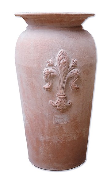 Klassischer, runde Terracotta Amphore aus Impruneta mit florentinischer Lilie.