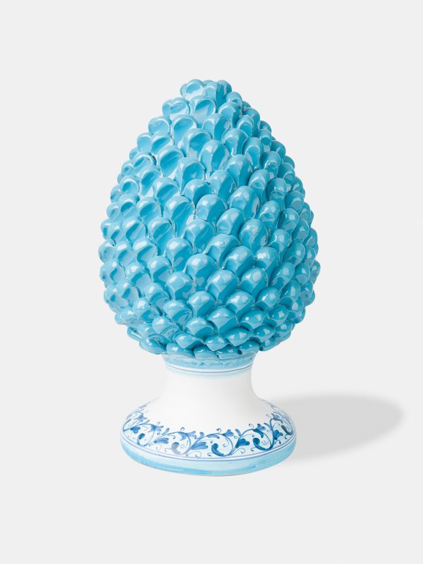 Der Pinienzapfen aus Keramik aus Sizilien ist ein traditionelles und kunstvolles Stück italienischer Handwerkskunst. Der hellblaue Zapfen, detailreich und sorgfältig von Hand gefertigt, sitzt auf einem kunstvoll verzierten Fuß. Der Fuß ist mit einem filigranen, hellblauen Blumendekor auf weißem Hintergrund geschmückt, was dem Objekt eine harmonische und elegante Ausstrahlung verleiht. Der Pinienzapfen selbst ist ein Symbol für Lebenskraft, Unsterblichkeit, Fruchtbarkeit und Regeneration und ist tief in der sizilianischen Tradition verwurzelt. In verschiedenen Größen erhältlich, wird dieses Kunstwerk oft als Glücksbringer in Haushalten platziert, um Gesundheit und Wohlstand zu fördern.