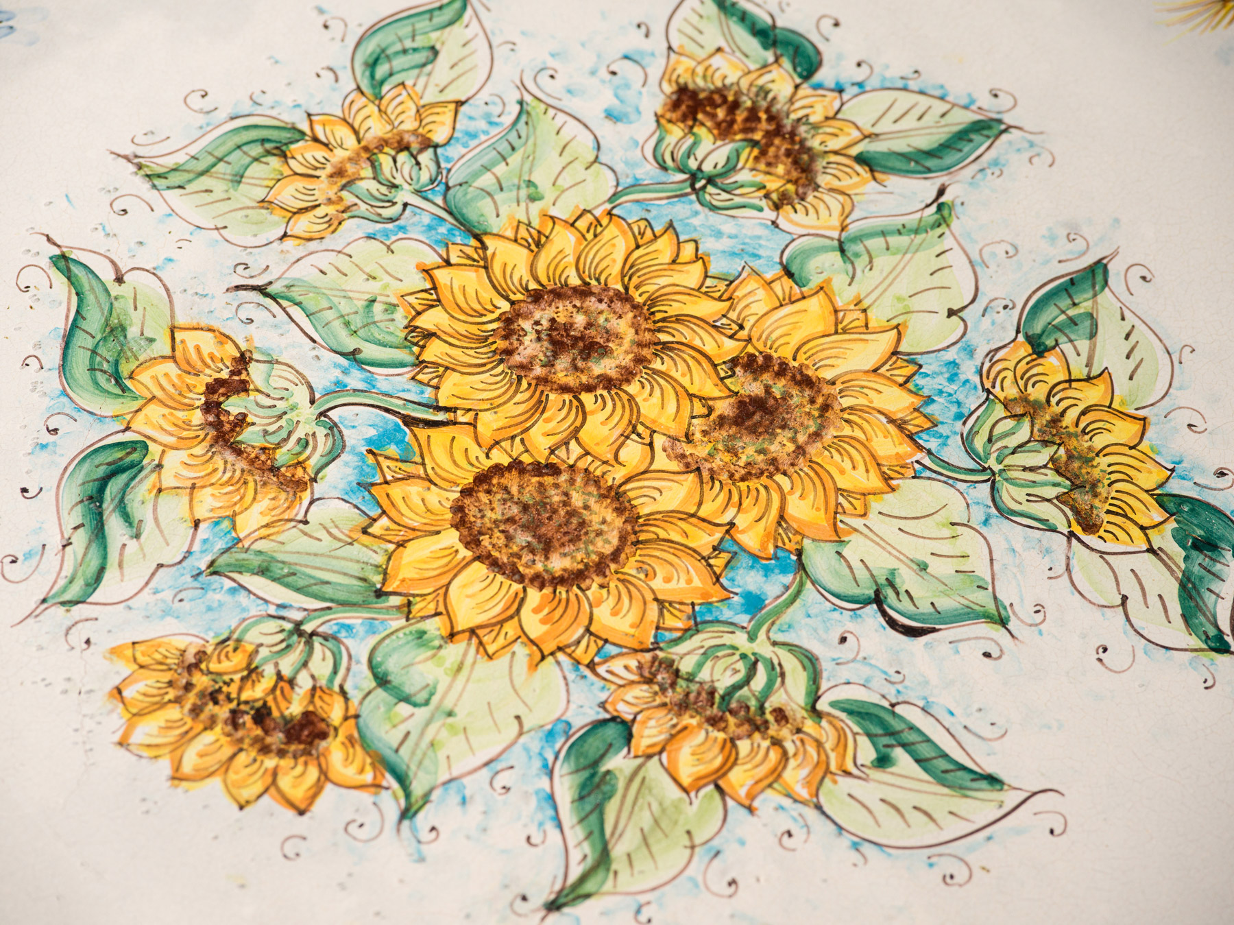 Die Kombination aus der Festigkeit des Lavasteins, dem kunstvollen schmiedeeisernen Fuß und der lebendigen Pracht der Mohn- und Sonnenblumen schafft einen eindrucksvollen Anblick. Der Tisch strahlt sowohl Stärke als auch eine unvergleichliche Schönheit aus, und die präzisen Details erzählen die Geschichte von kunstvoller Handwerkskunst und natürlicher Anmut.