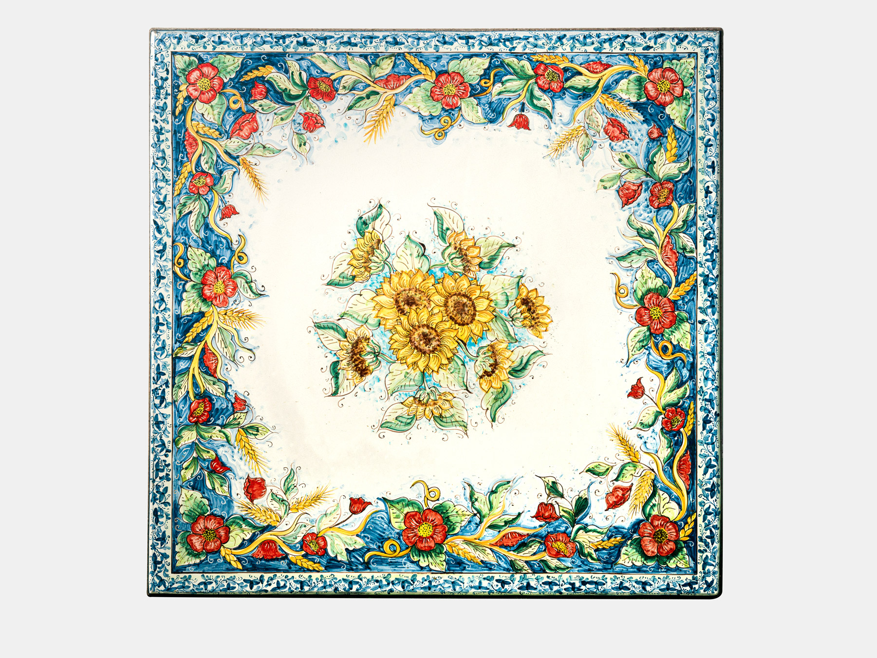 Ein quadratischer Tisch aus Lavastein ruht auf einem stabilen schmiedeeisernen Fuß, der ihm eine robuste Grundlage verleiht. Seine klaren Kanten und Ecken strahlen Präzision aus und bilden eine perfekte Symmetrie. Entlang des Randes des Tisches sind kunstvoll gestaltete Mohnblumen in lebendigen Farben von Rot, Orange und Pink zu sehen. Ihre Blütenblätter scheinen regelrecht in den Lavastein eingebettet oder als reliefartige Muster herausgearbeitet zu sein, um eine farbenfrohe und lebhafte Umrandung für den Tisch zu bilden. In der Mitte des Tisches erheben sich majestätische Sonnenblumen. Ihre leuchtend gelben Blütenköpfe sind detailreich in den Lavastein gemeißelt, und ihre strahlende Schönheit zieht sofort alle Blicke auf sich, wodurch sie den Mittelpunkt des Tisches markieren.
