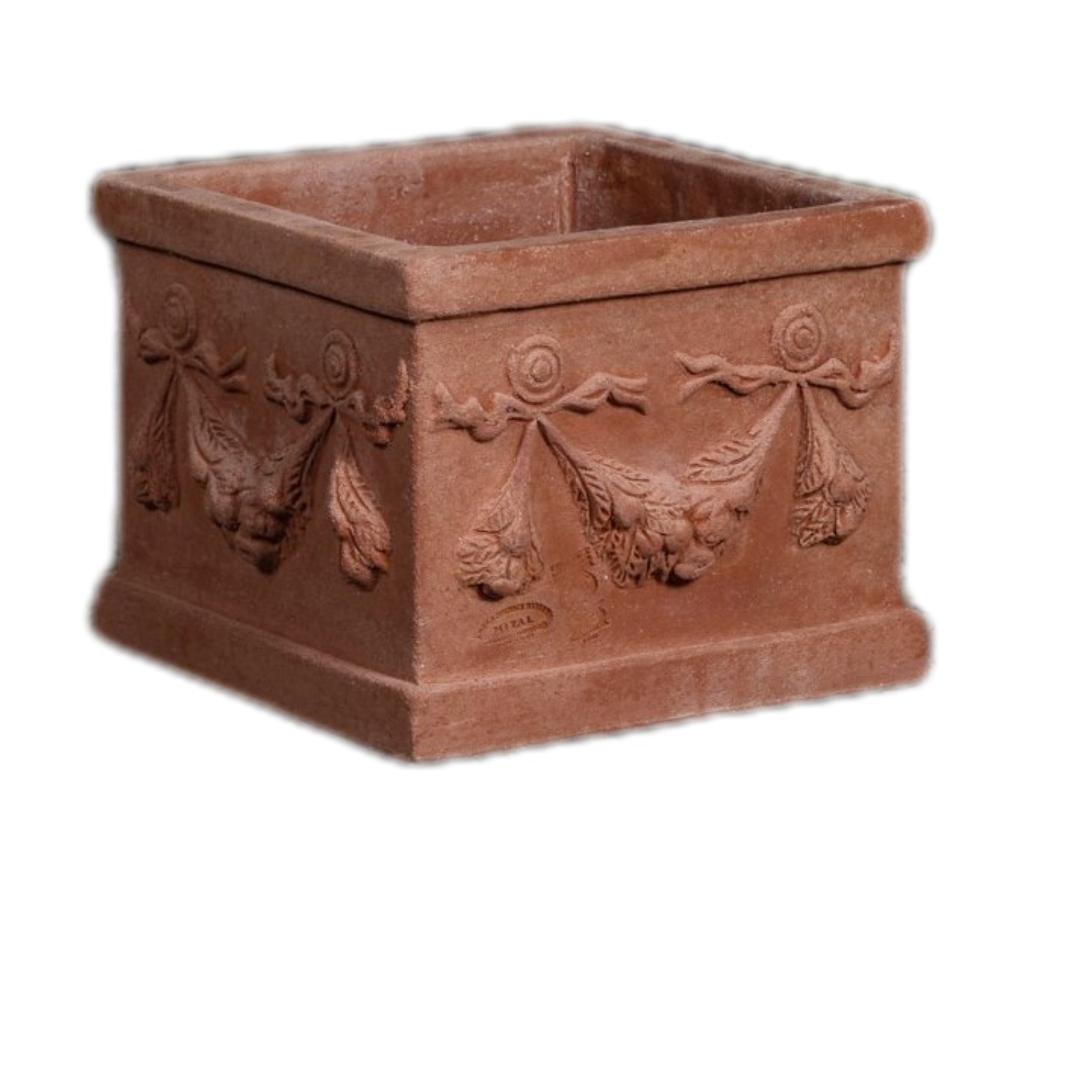 Klassischer, quadratischer Terracottakasten mit edler Dekoranke aus Impruneta
