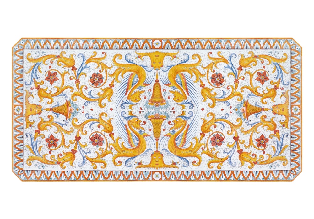 Der handbemalte rechteckige Tisch aus Umbrien ist ein Meisterwerk italienischer Handwerkskunst und inspiriert von der kunstvollen Tradition der Majolika-Malerei aus Deruta. Seine aufwendige Dekoration geht auf das 17. Jahrhundert zurück und orientiert sich an dem dekorativen Stil, den Raffael für die Fresken der Stanzen des Vatikans entwickelte. Aufgrund dieser kunsthistorischen Verbindung wird das Muster häufig als Raffael-Stil bezeichnet.