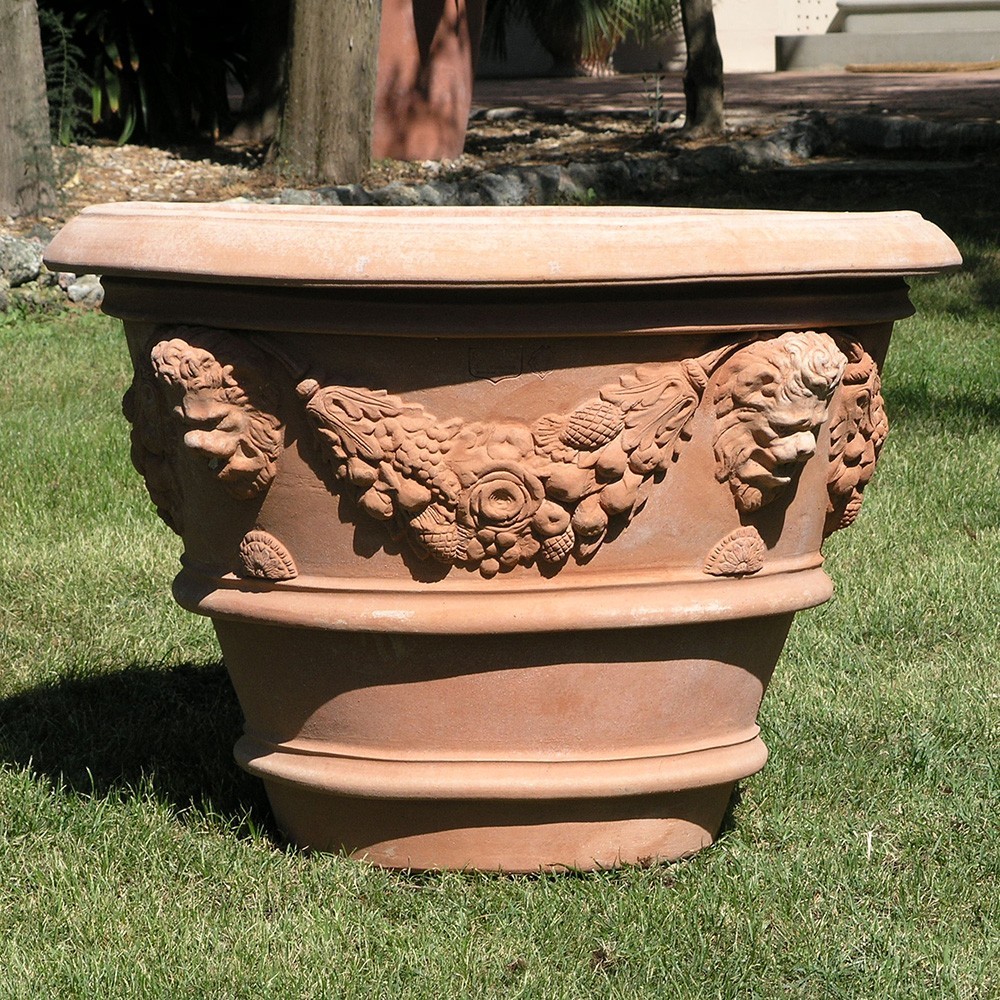 Der riesige Terracottatopf, der mit Löwenköpfen, Obstranken und Rosetten verziert ist, zeugt von einer eindrucksvollen handwerklichen Kunstfertigkeit. Hergestellt aus frostresistenter Impruneta-Terrakotta, besticht er nicht nur durch seine beeindruckende Größe, sondern auch durch seine robuste Qualität. Die Oberfläche des Topfes ist mit detaillierten Löwenköpfen geschmückt, die majestätisch herausragen und dem Gefäß eine königliche Aura verleihen. Zwischen den Löwenköpfen winden sich kunstvoll gestaltete Obstranken, die dem Terracottatopf eine natürliche und organische Note verleihen. Diese filigranen Verzierungen zeugen von einer meisterhaften Handwerkskunst, die in der Tradition der Impruneta-Terrakotta wurzelt. Die Rosetten, die den Rand des Topfes schmücken, setzen zusätzliche Akzente und verleihen dem Gefäß eine elegante Ausstrahlung. Die Verwendung von frostresistenter Terrakotta aus Impruneta garantiert nicht nur eine lange Haltbarkeit, sondern auch eine Widerstandsfähigkeit gegenüber extremen Wetterbedingungen, insbesondere Frost. Insgesamt präsentiert sich der Terracottatopf als harmonische Verbindung von kunstvoller Verzierung und funktionaler Robustheit, ein beeindruckendes Element, das sowohl im Innen- als auch im Außenbereich für bewundernde Blicke sorgt.