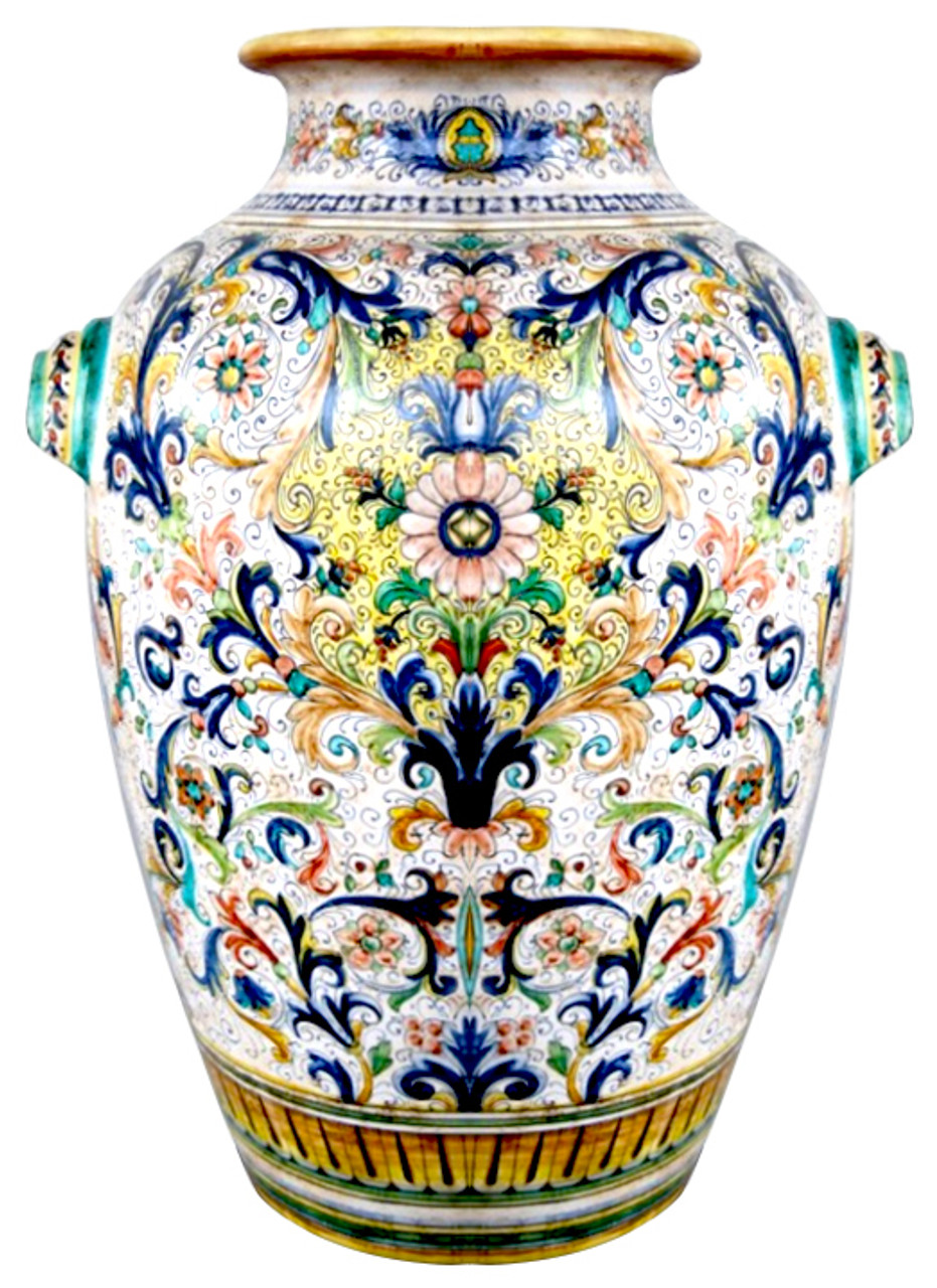 Diese große Bodenvase aus Deruta-Keramik ist ein prächtiges Beispiel italienischer Handwerkskunst. Diese Vase ist mit einem hellen Hintergrund glasiert, der als perfekte Leinwand für die kunstvollen Verzierungen dient. Die Dekoration besteht aus kunstvollen Voluten (spiralförmigen Ornamenten) und Blumenmotiven, die in harmonischer Komposition über die Oberfläche verteilt sind.