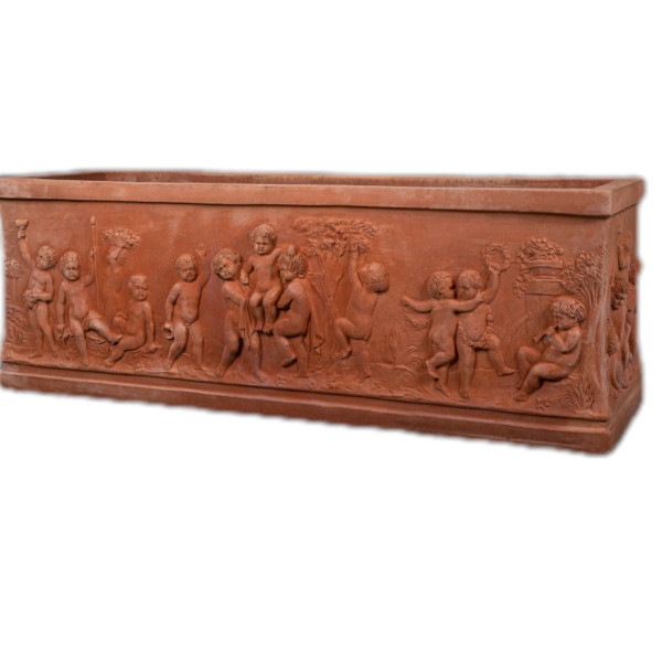 Der Blumenkasten ist sorgfältig gestaltet und verfügt über eine prächtige Verzierung mit antiken Putten, die dem Kasten einen klassischen und eleganten Charakter verleihen. Die Putten sind kunstvoll modelliert und musizieren, tanzen und feiern.