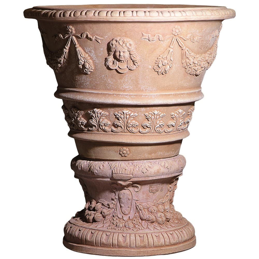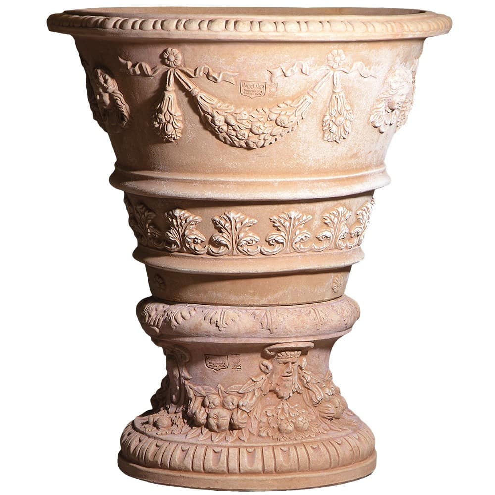 Jedes Stück wird in traditioneller Handarbeit in der Toskana gefertigt und ist ein Unikat mit individuellem Charakter. Der zweiteilige Aufbau – bestehend aus Topf und passender Basis – unterstreicht seine imposante Erscheinung und verleiht ihm eine harmonische, repräsentative Wirkung.
