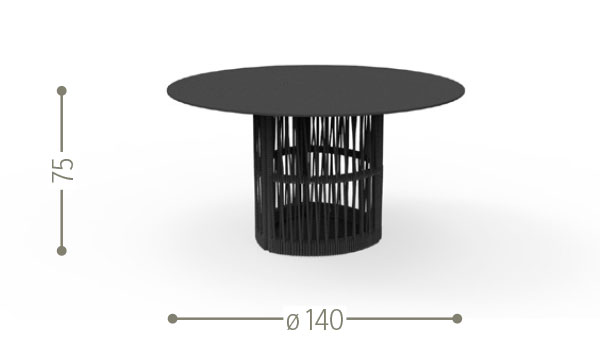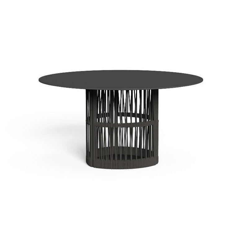 Dieser runde Esstisch von Talenti besteht aus einer Aluminiumplatte, die von einer Seilkonstruktion optisch getragen wird. Die runde Platte misst 140 cm im Durchmesser.