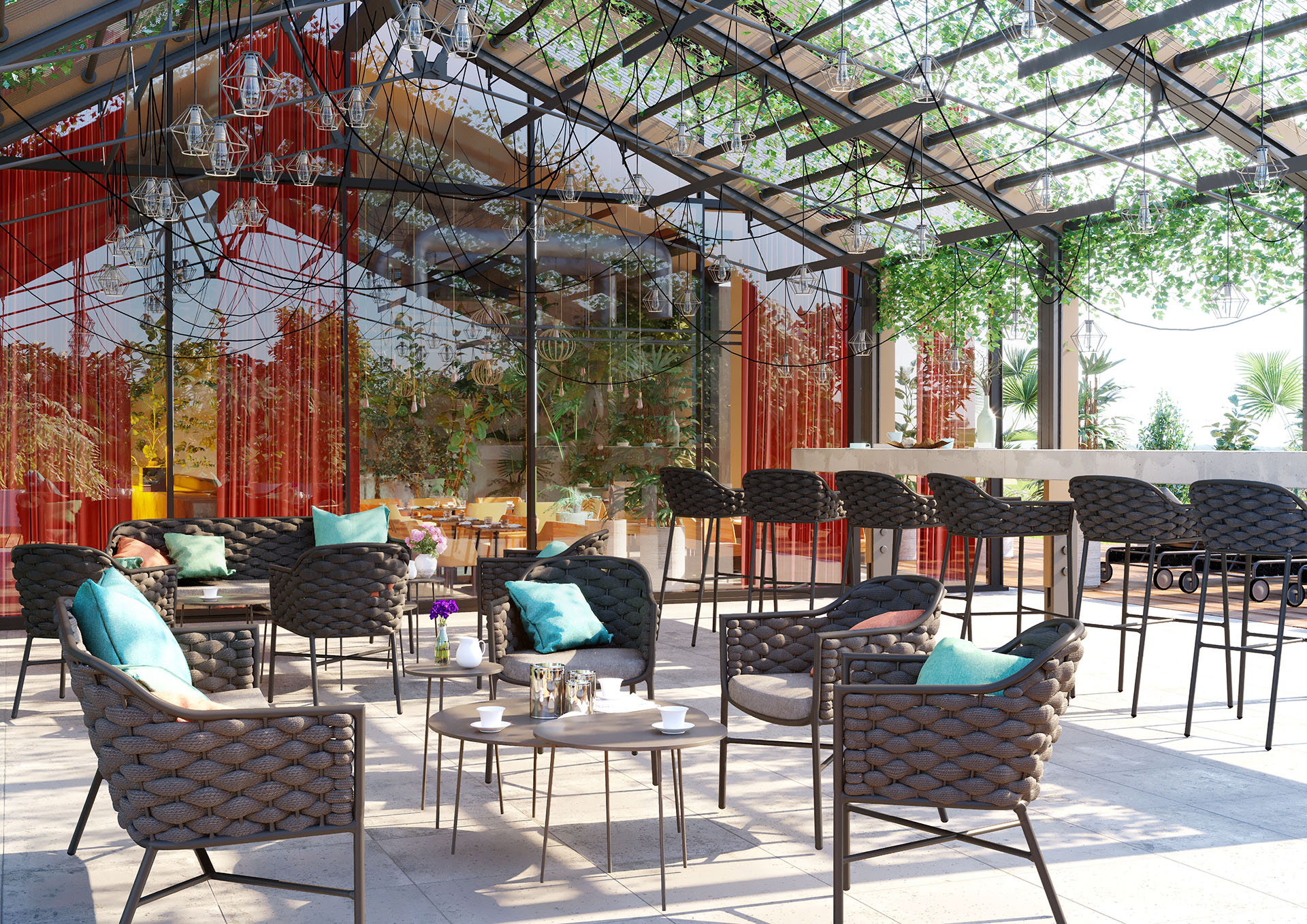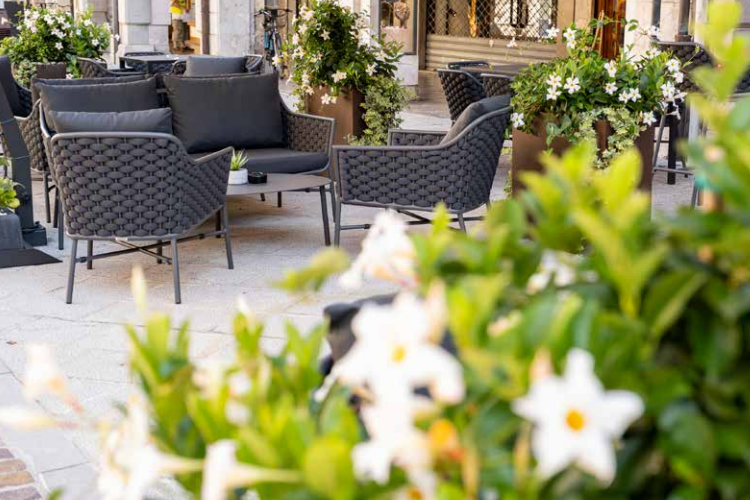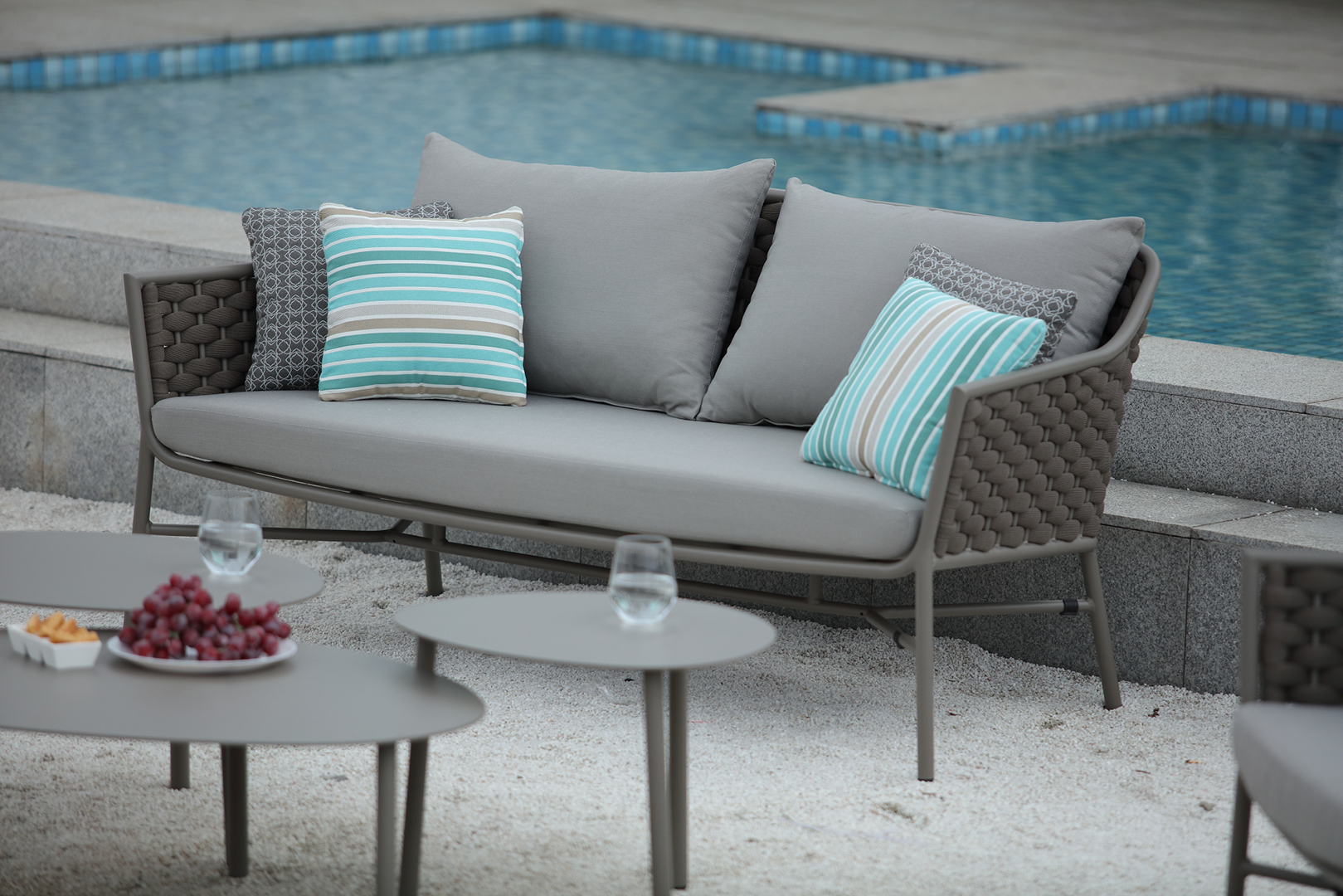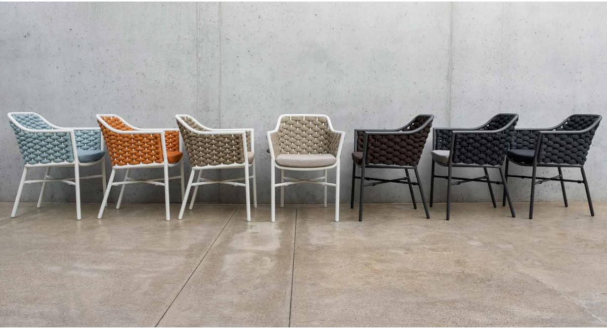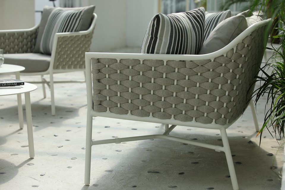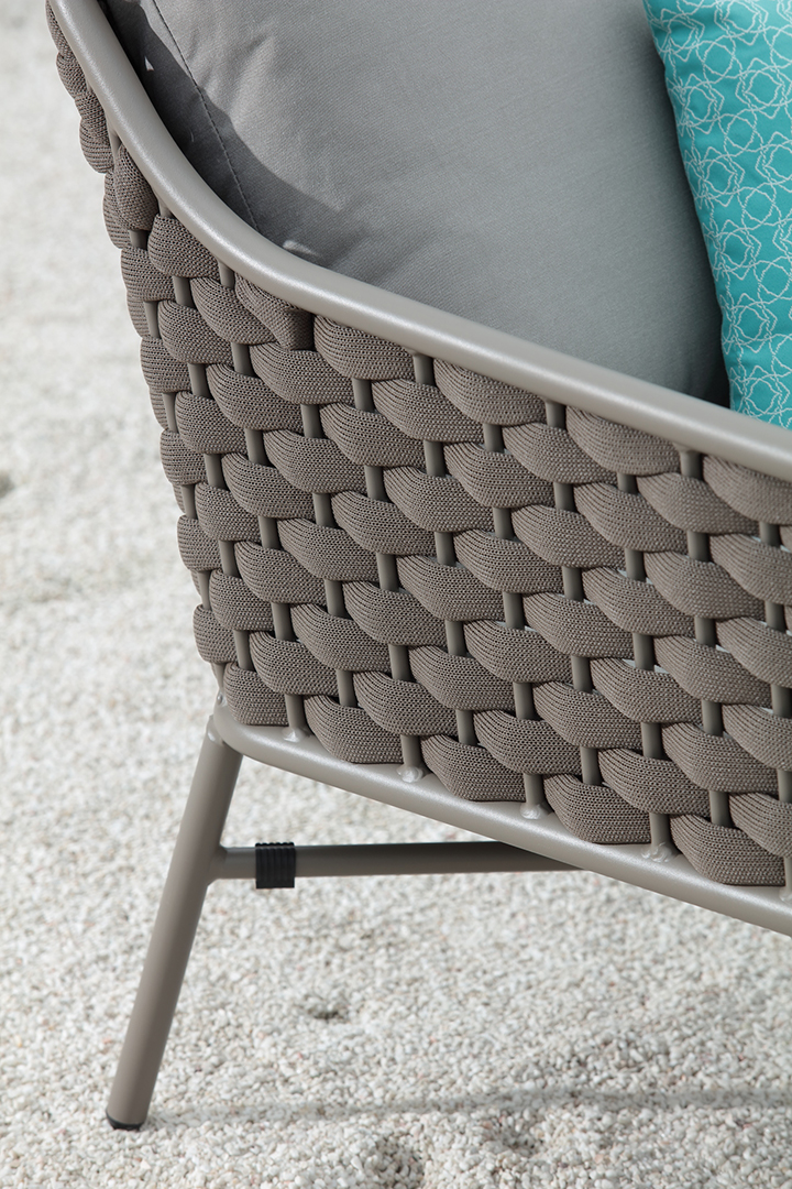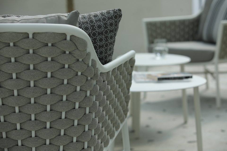 Die Gestelle der Sitzmöbel bestehen aus pulverbeschichtetem Aluminium, die Rückenlehnen sind aus hochwertigem Textil geflochten. Die Polster aus modernem Polyester sind wetterfest und komfortabel. Das Set wird komplett geliefert, keine Montage.